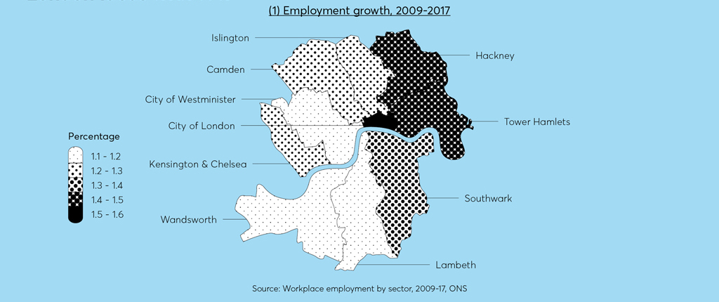 Employment levels in all ten central London boroughs (those containing part of the Central Activities Zone) have increased since the crash. Whilst some boroughs experienced a slight dip in 2008-11, employment across central London recovered quickly, and is on the rise. Growth in employment has been particularly strong to the east, with the City of London, Tower Hamlets, Hackney and Southwark seeing the most growth in recent years.