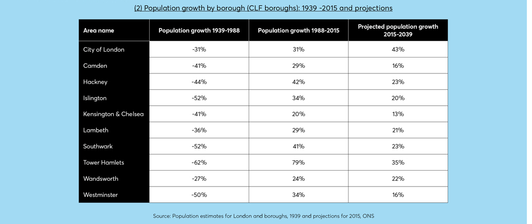 The postwar years saw a substantial decline in central London’s population, driven by a mixture of deliberate government policy, changes in the economy and individual choice. By the late 1980s this trend had gone into reverse and population growth is projected to continue in the future. Several boroughs – notably the City of London and Tower Hamlets – are projected to experience significant levels of population growth between 2015-2039.