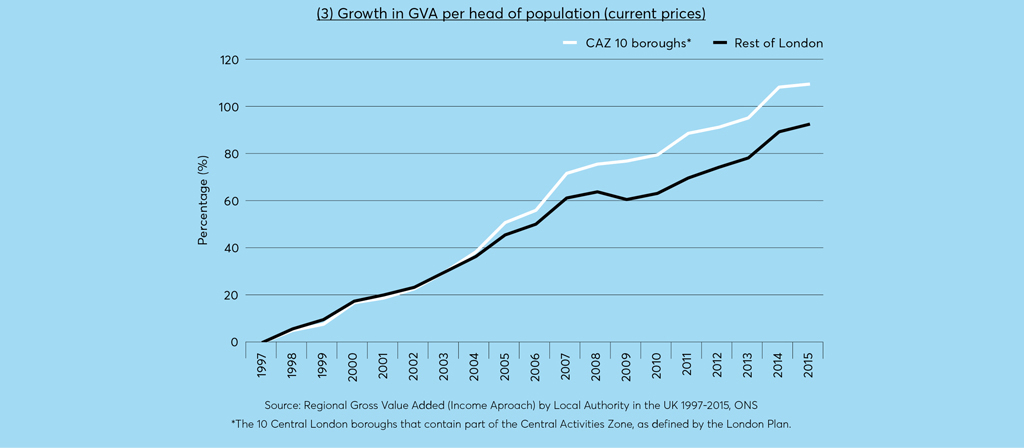 Central London’s economic output per head (as measured by Gross Value Added, GVA) is growing at a faster rate than the London average, a trend that emerged in the mid-2000s and has continued since. The 2008-9 financial crisis, which was expected to hit economic output in central London particularly hard, seems to have had the opposite effect. The contribution of London’s 10 central London boroughs has also continued to increase as a proportion of London’s overall GVA, albeit a little more slowly, in the years following the crash.