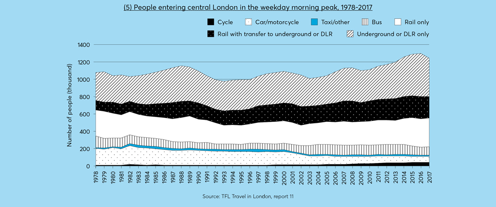 The number of people commuting into central London in the weekday morning peak has increased over the past four decades. The type of transport they chose, however, have varied a little. There has been an increase in the number of people using the underground and an increase in rail and cycle journeys over this time period. Since 2000, there’s been a gradual decline in car and motorcycle use which demonstrates the impact of the Congestion Charge (launched in 2003).