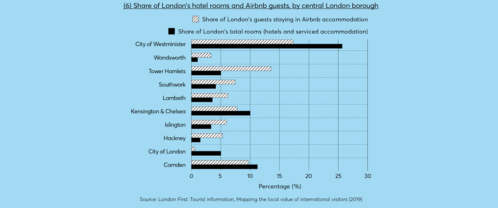 Central London remains a popular tourist destination. Westminster, Camden, and Kensington and Chelsea are the most popular destinations for tourist accommodation, both in terms of hotel and serviced accommodation rooms and in Airbnb lettings. Tower Hamlets is home to a surprisingly large share of the Airbnb market.