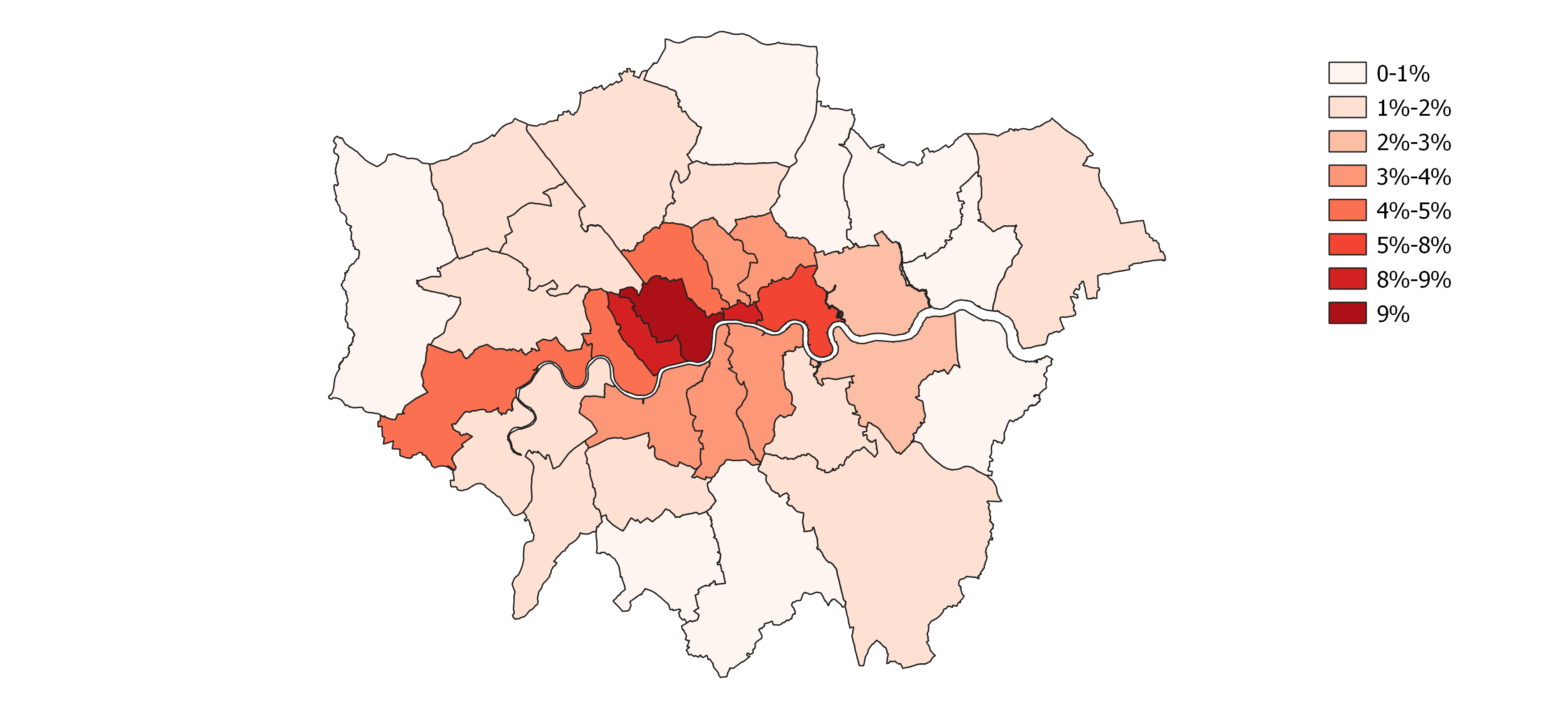 Properties registered with an overseas address are concentrated in inner London and Hounslow, where 5% of properties are foreign owned. Westminster has the highest proportion of foreign ownership at 9%. Merton has the lowest – just 0.3%.