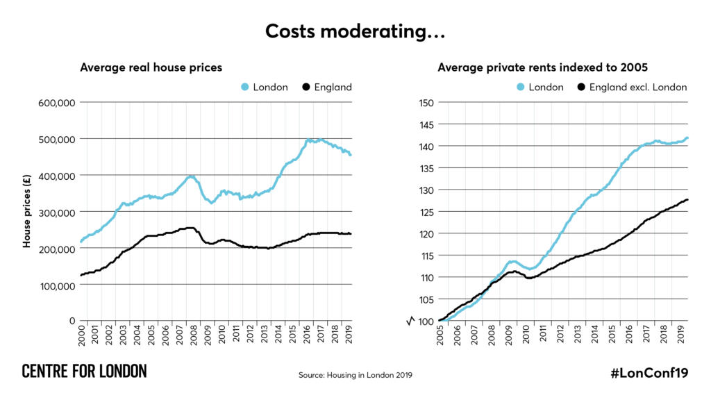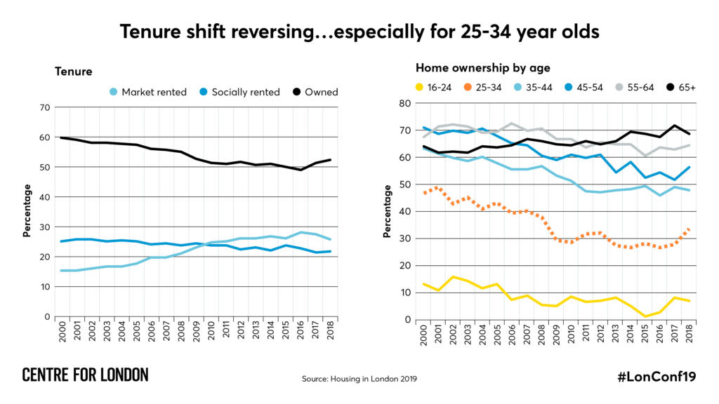 The long-term shift from owner-occupation to renting also seems to have been checked. Market renting levels have been falling since 2016, as owner-occupation rates have risen to around 52 per cent – the level they were in 2012. This rise in owner-occupation has been sharpest among 25-34 year olds, whose rate of owner-occupation fell from almost 50 per cent to below 30 per cent in 2013. Today than a third of this age group – core millennials – own homes, the highest level since the financial crash. Perhaps the decline of buy-to-let investing, alongside more generous Help-to-Buy loans available in London since 2016, and more stable prices, are starting to have an impact.