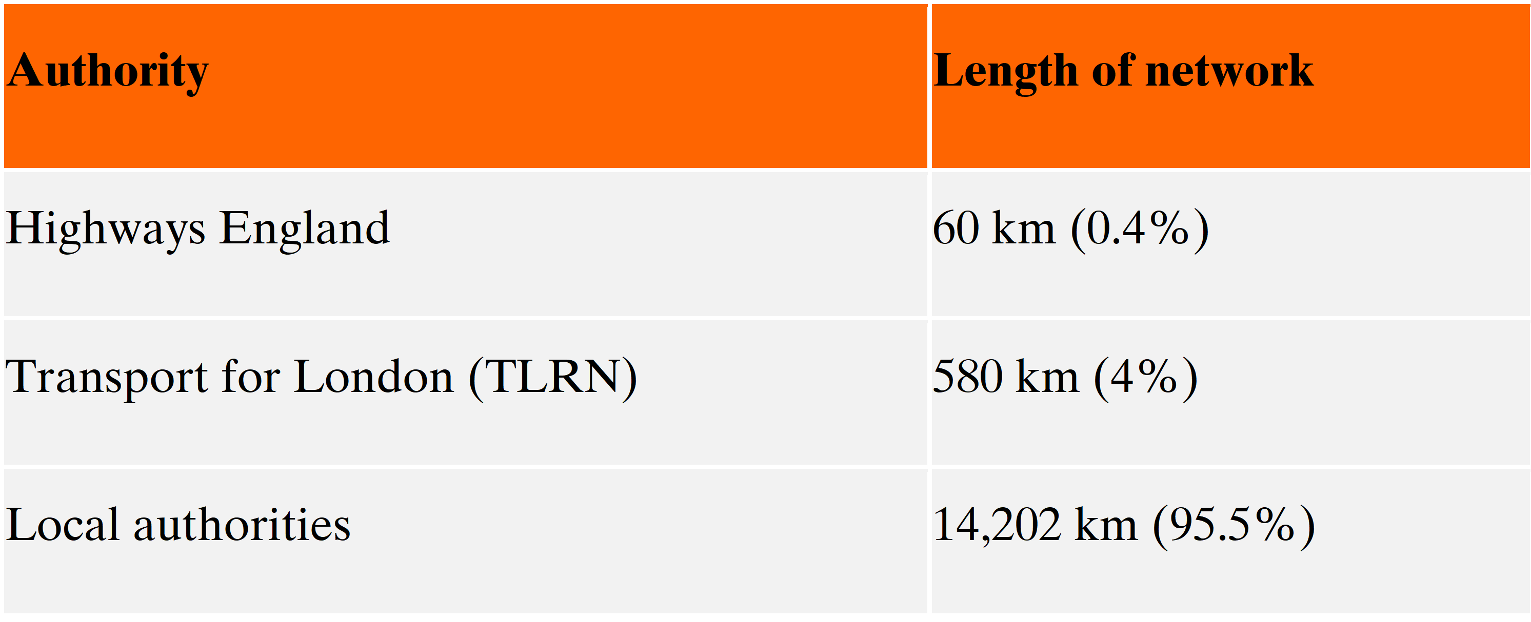 Highways England – the national agency that operates and maintains England’s major roads – is only responsible for the motorways within the Greater London boundary, which comprise less than 0.5 per cent of London’s total road network. Transport for London (TfL) manages the 580km-long strategic road network (the red routes). This represents just four per cent of the total road length, but it carries 30 per cent of all traffic in the capital. The remainder – a dense network of local roads – is managed by local authorities – and funded by a mixture of grants and local revenues such as parking.