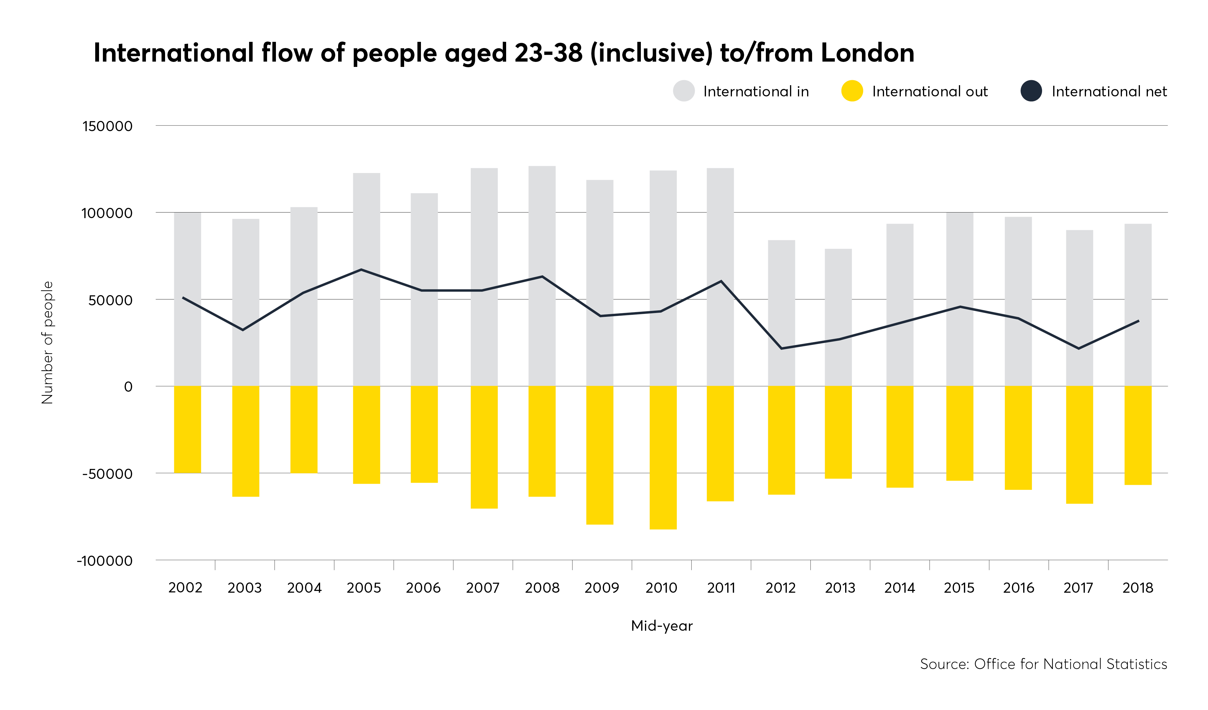 And as much as internal markets shape patterns of movement, so too does ebb and flow of global migration. However, unlike migration within the UK, international flows of millennials are subject to far greater fluctuation.