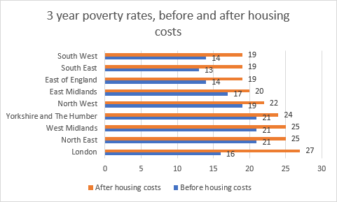 Activists, campaigners and politicians – and of course Londoners themselves – are well aware that millions of people in London live in poverty. They also know that people’s chances of living in poverty are deeply affected by who they are: poverty is more likely for women (especially mothers), Black and Asian Londoners, LGBT Londoners, and Londoners with disabilities – and these inequalities intersect. Poverty in London is a bit different to other parts of the country, as it is more strongly driven by housing costs.