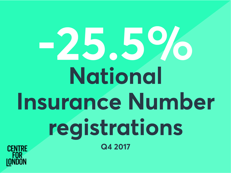 The number of foreign workers arriving in the capital continued to fall, with little more than 61,500 National Insurance number registrations in the final three months of 2017. This was down over a quarter (-25.5 per cent) compared to the same period
