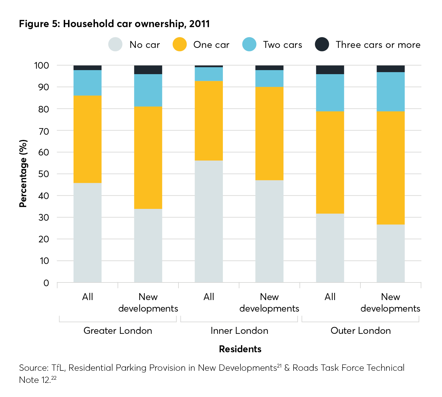 Yet recent housing developments are more likely than pre-existing housing to feature car parking, and their residents are more likely to own a car than the average Londoner. Many residents also use their cars frequently, even in areas with excellent public transport access.