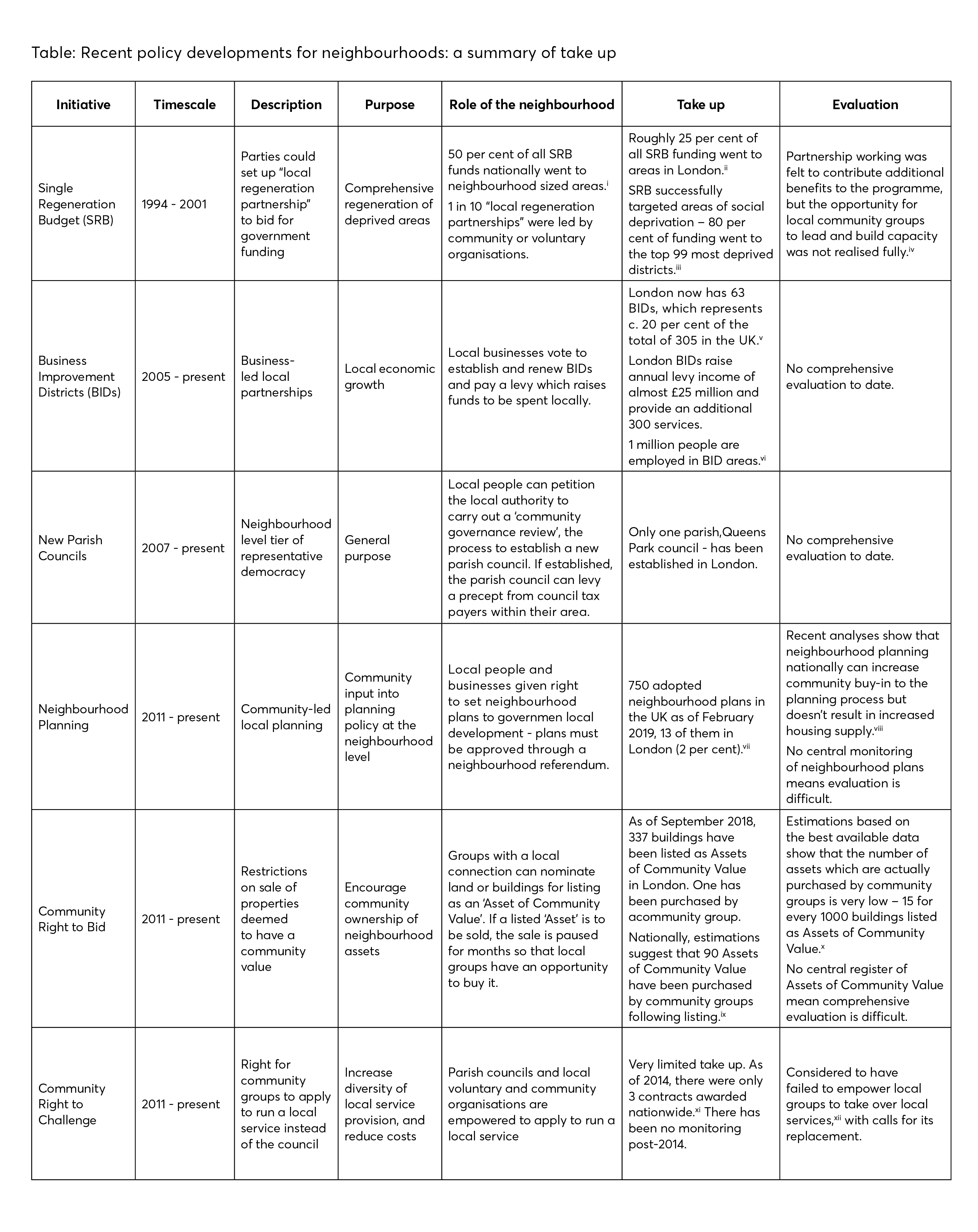 Endnotes – Table: Recent policy developments for neighbourhoods: a summary of take up