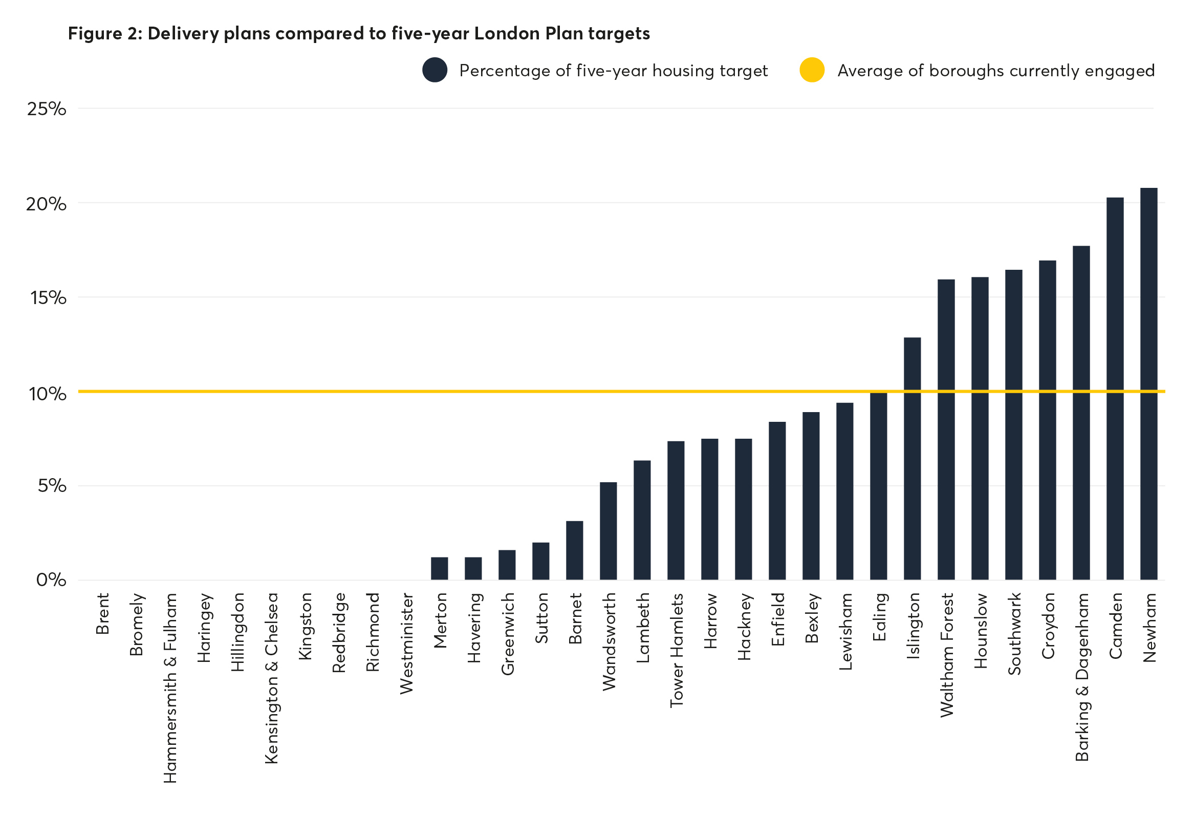 Active London boroughs (see Table 5) would meet 10 per cent of London Plan targets on average through council-led approaches. This ranges from around 20 per cent in Newham and Camden, to nearer one per cent for outer London boroughs with smaller programmes and high housing targets such as Havering and Merton (see Figure 2 below).
