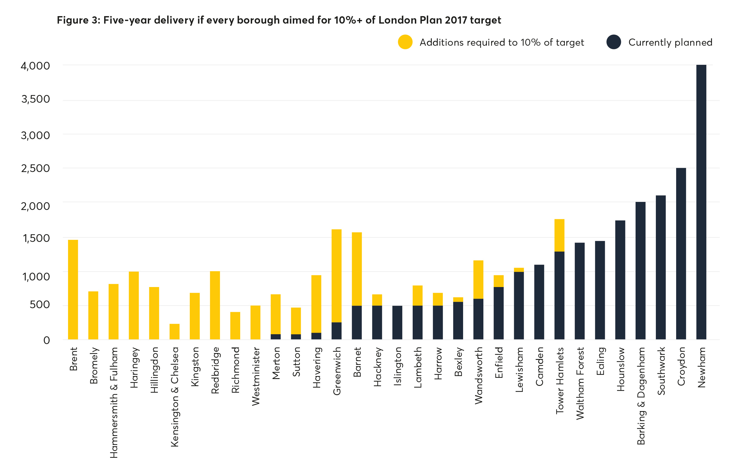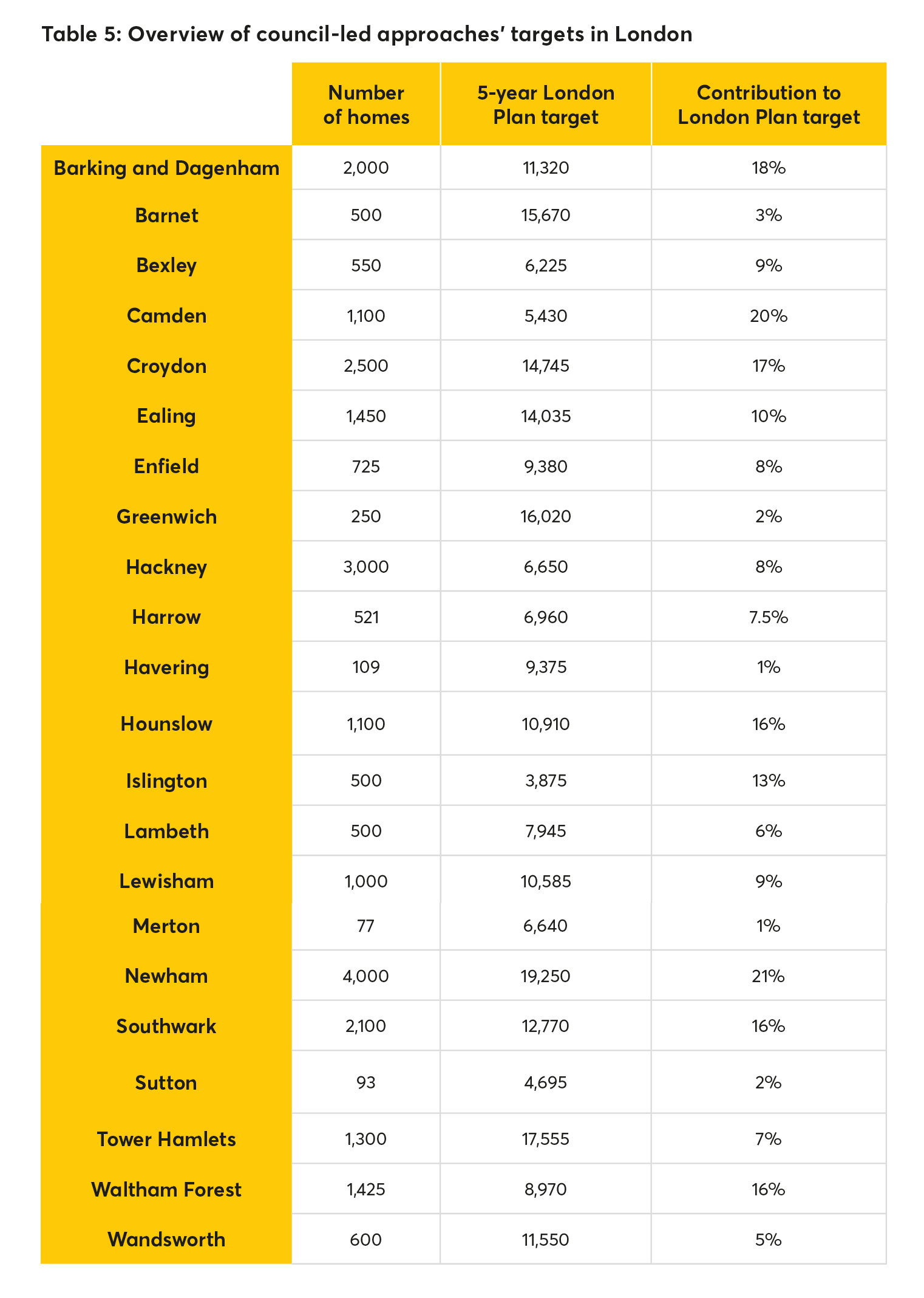 There is a notable disparity in councils’ delivery plans. However, if every borough were able to match the 10 per cent average delivery of those councils that are building (see Figure 3 below), a total of 37, 300 homes could be delivered across the next five years across London.
