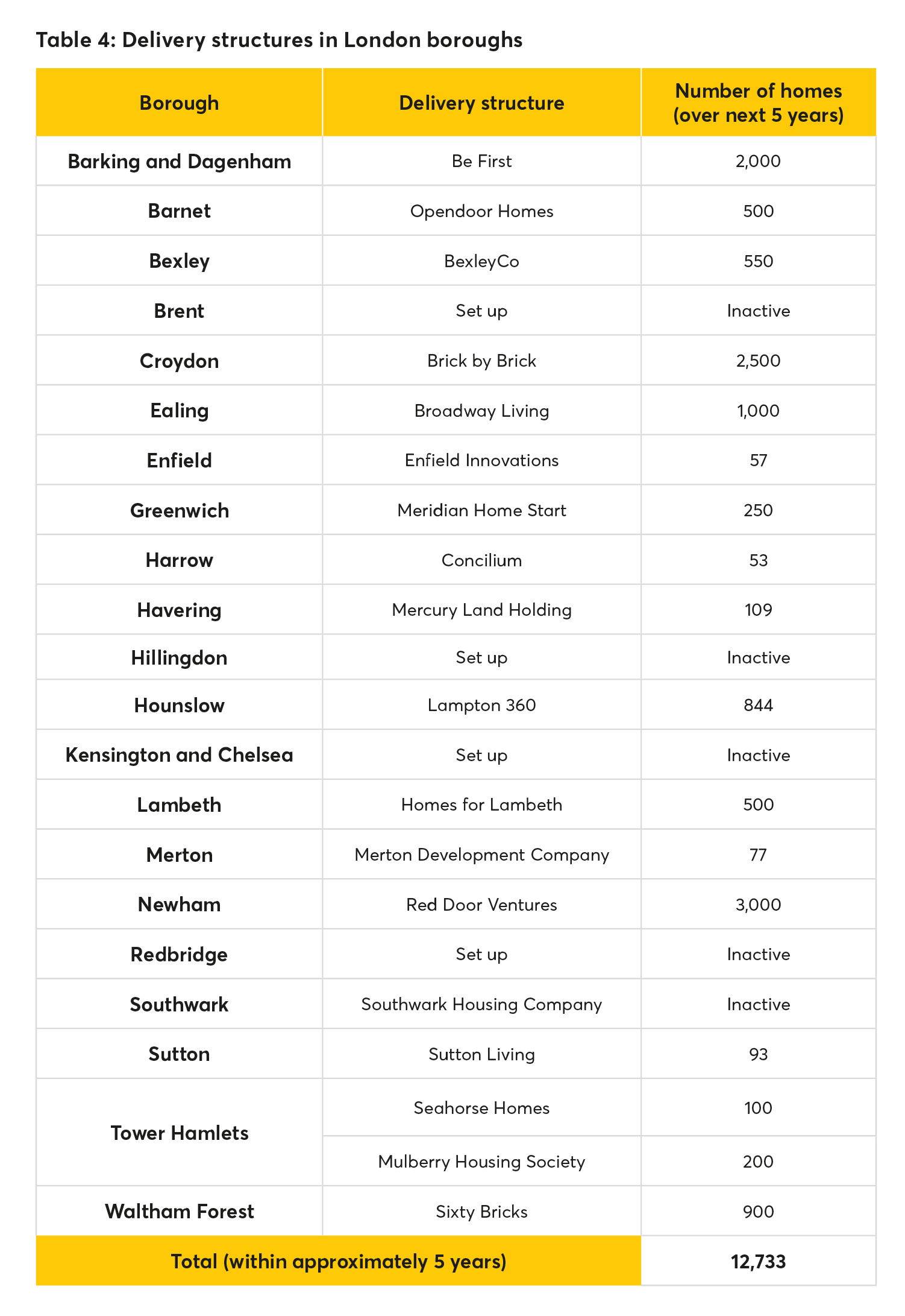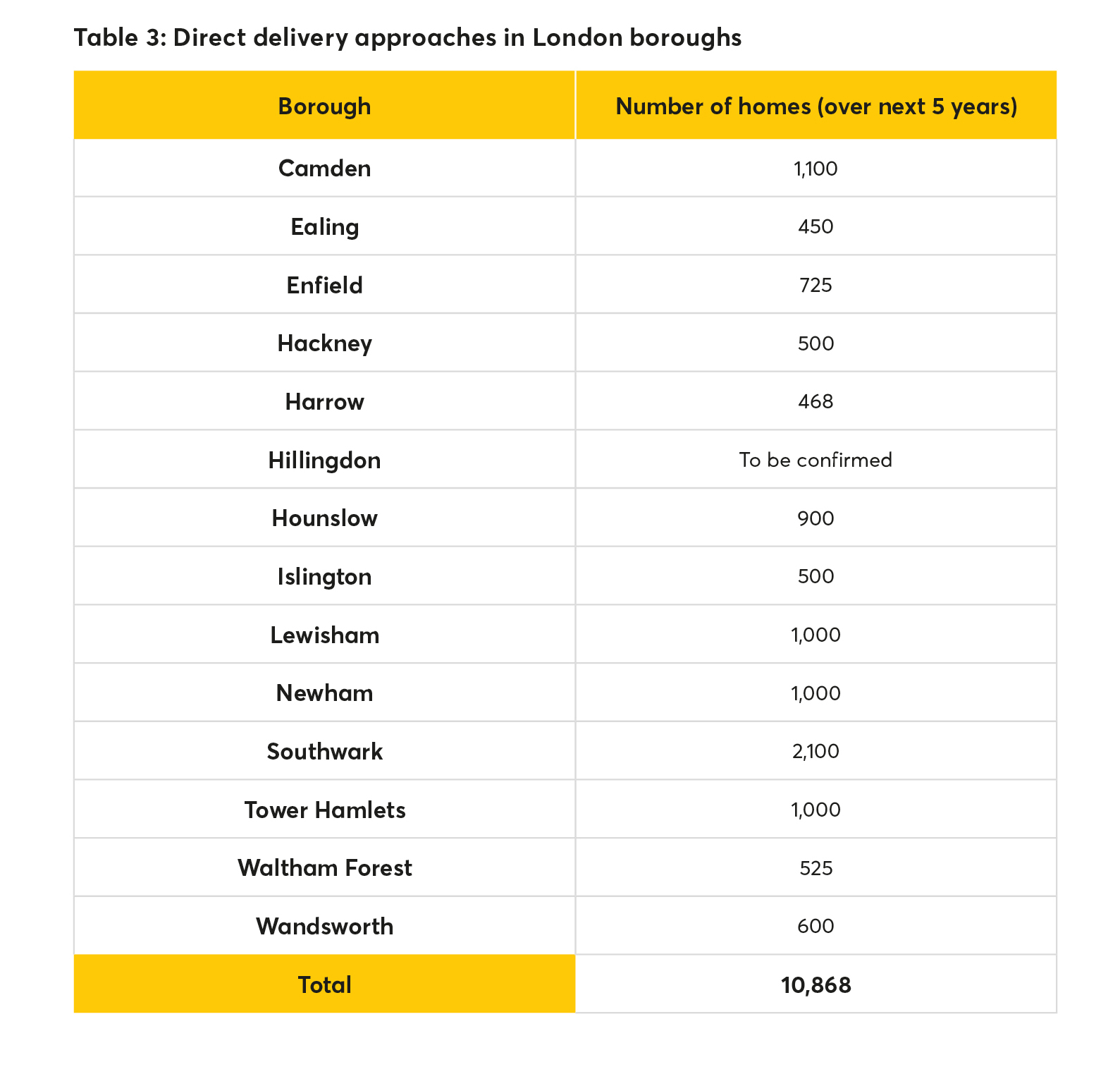 There are currently 14 boroughs that aim to undertake direct delivery within the next five years – with councils such as Hillingdon including provision for this in their budgets, but not having calculated the number of homes they will deliver. Their targets for the next five years add up to approximately 10,900 homes in the pipeline.