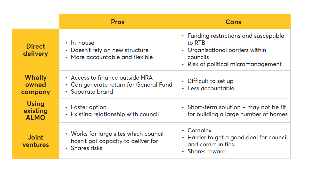 22 boroughs have homes in the pipeline through active council-led delivery models. Although there are pros and cons to each option – as outlined in the table below – it seems that with political will and vision, boroughs can play a bigger role in delivering housing locally, retain a longer-term stake in the development of their areas, and make the most of their existing assets.