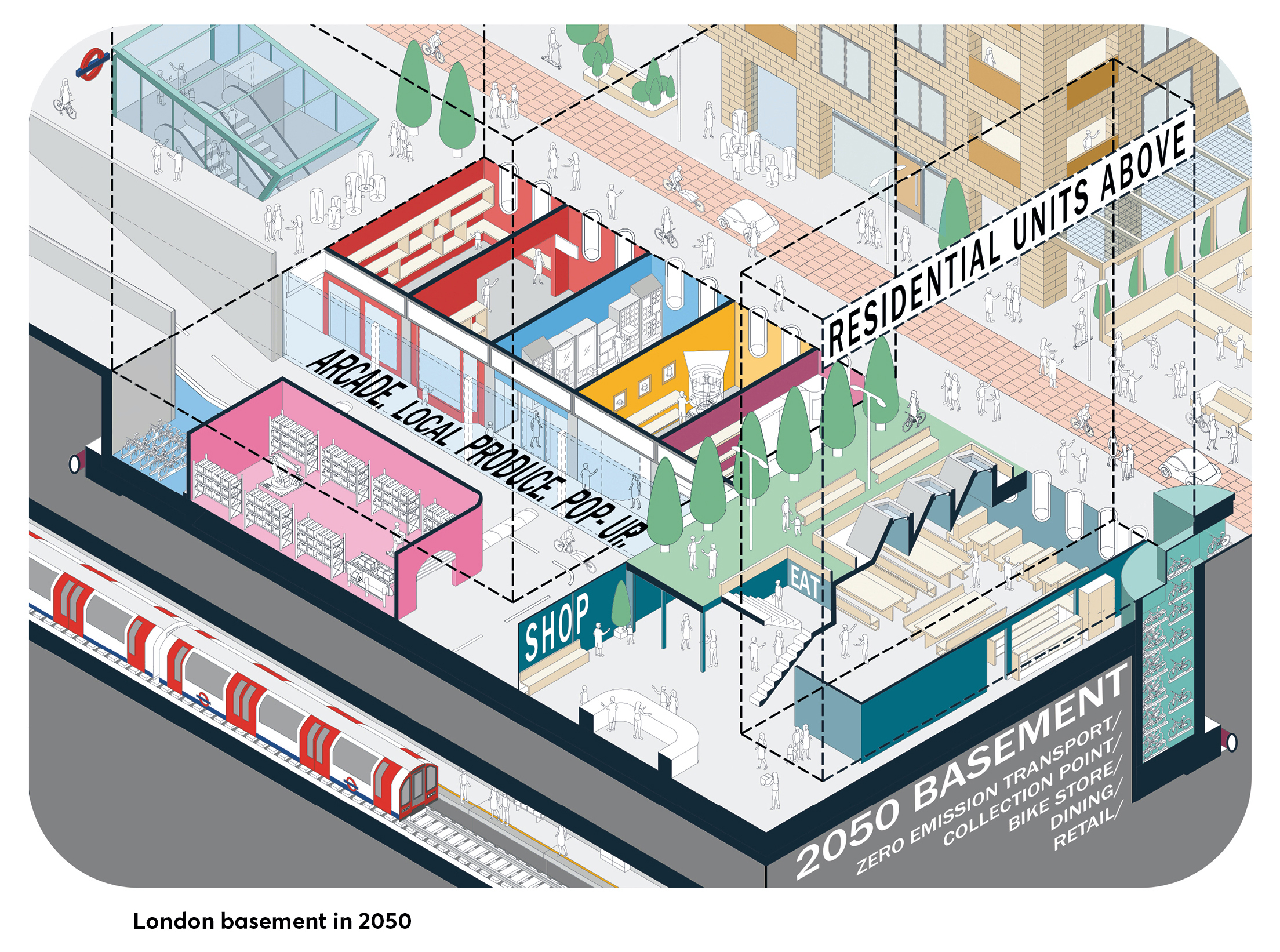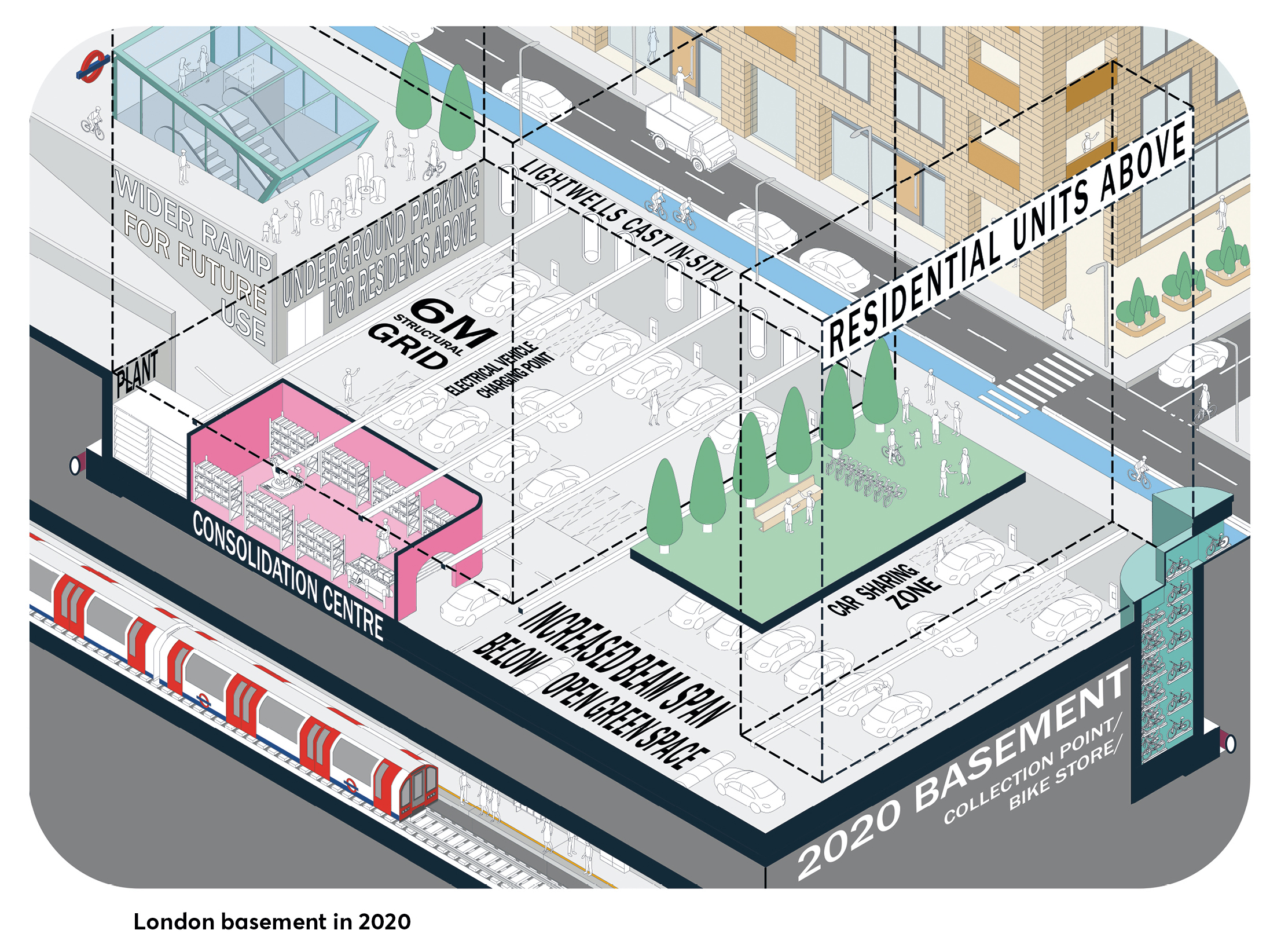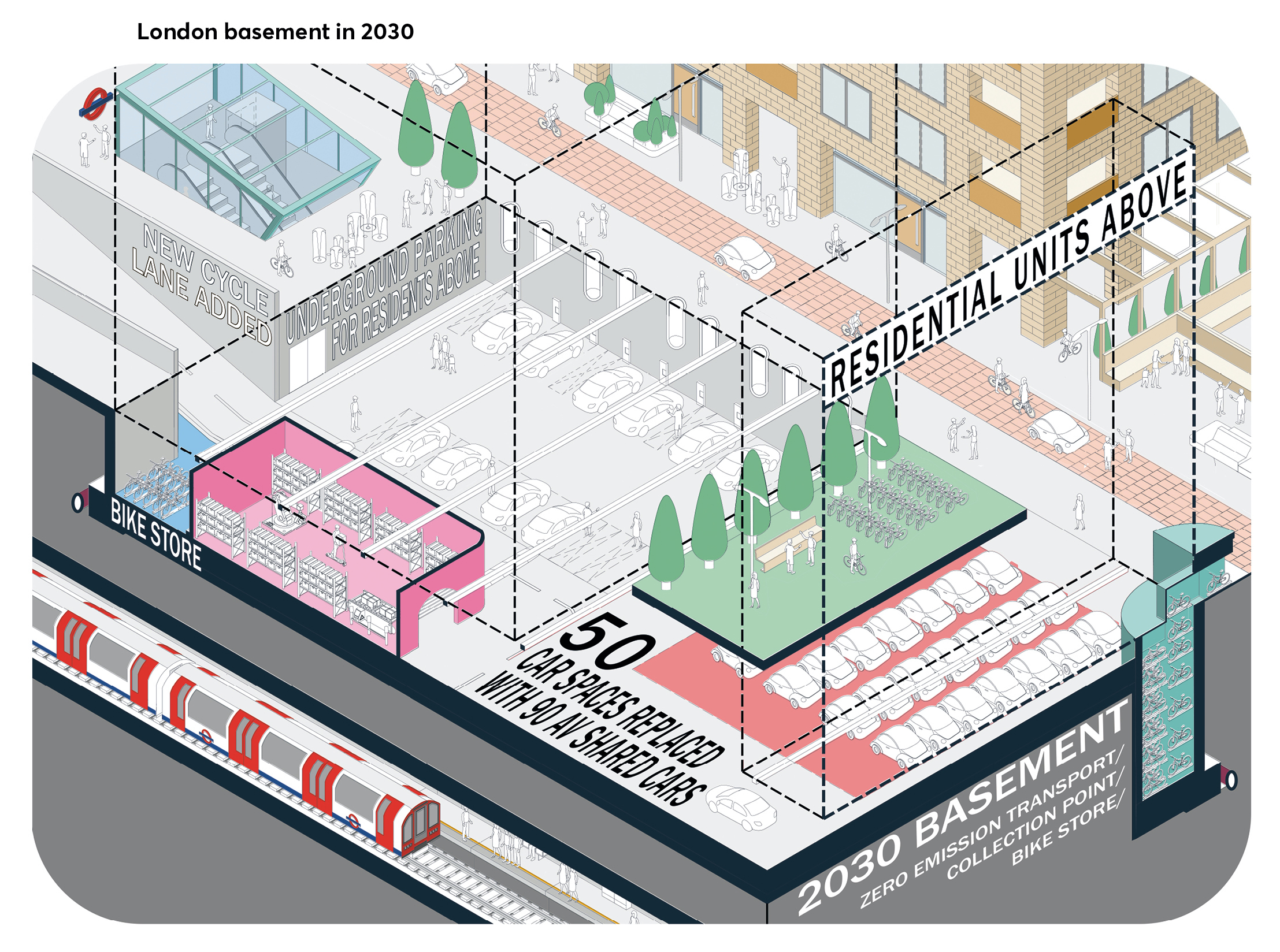 Where car parking needs to be provided, how can it work with the principles of New Urban Mobility, and enable a transition to new uses, as private car ownership declines? Re-using plans from one of their recent London developments, Hawkins\Brown illustrate the interventions and design features that can make a basement car park convertible to other uses, in a future where New Urban Mobility becomes the most convenient way of moving around London.
