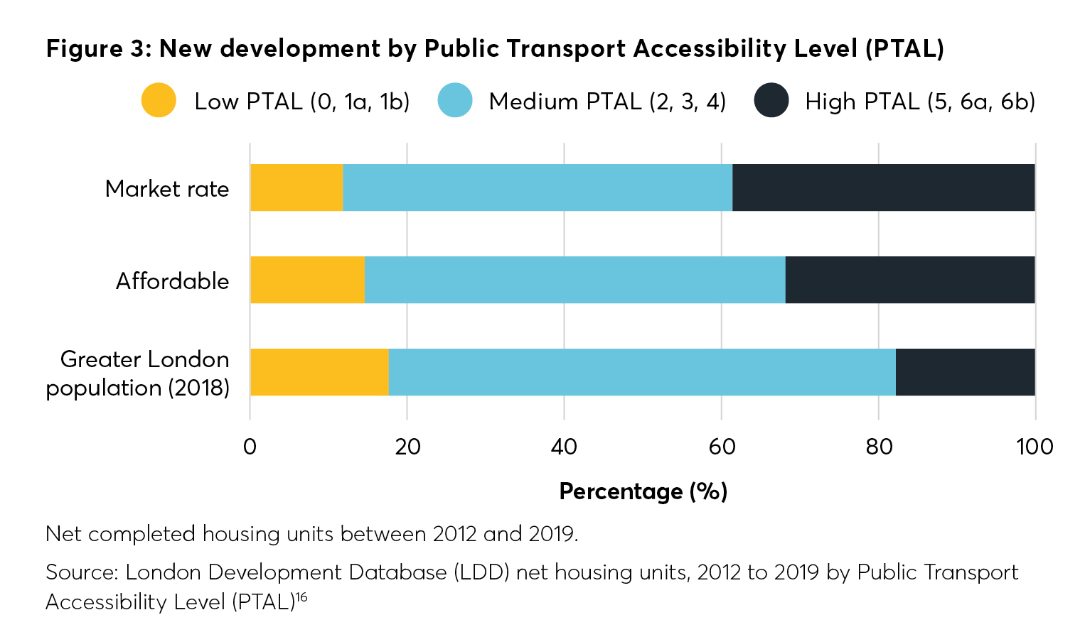 London’s new affordable housing units have lower public transport accessibility on average than new market housing, but are still better served by public transport than London’s existing housing stock. Figure 3 compares the public transport accessibility of new developments, completed since 2012, and pre-existing housing.