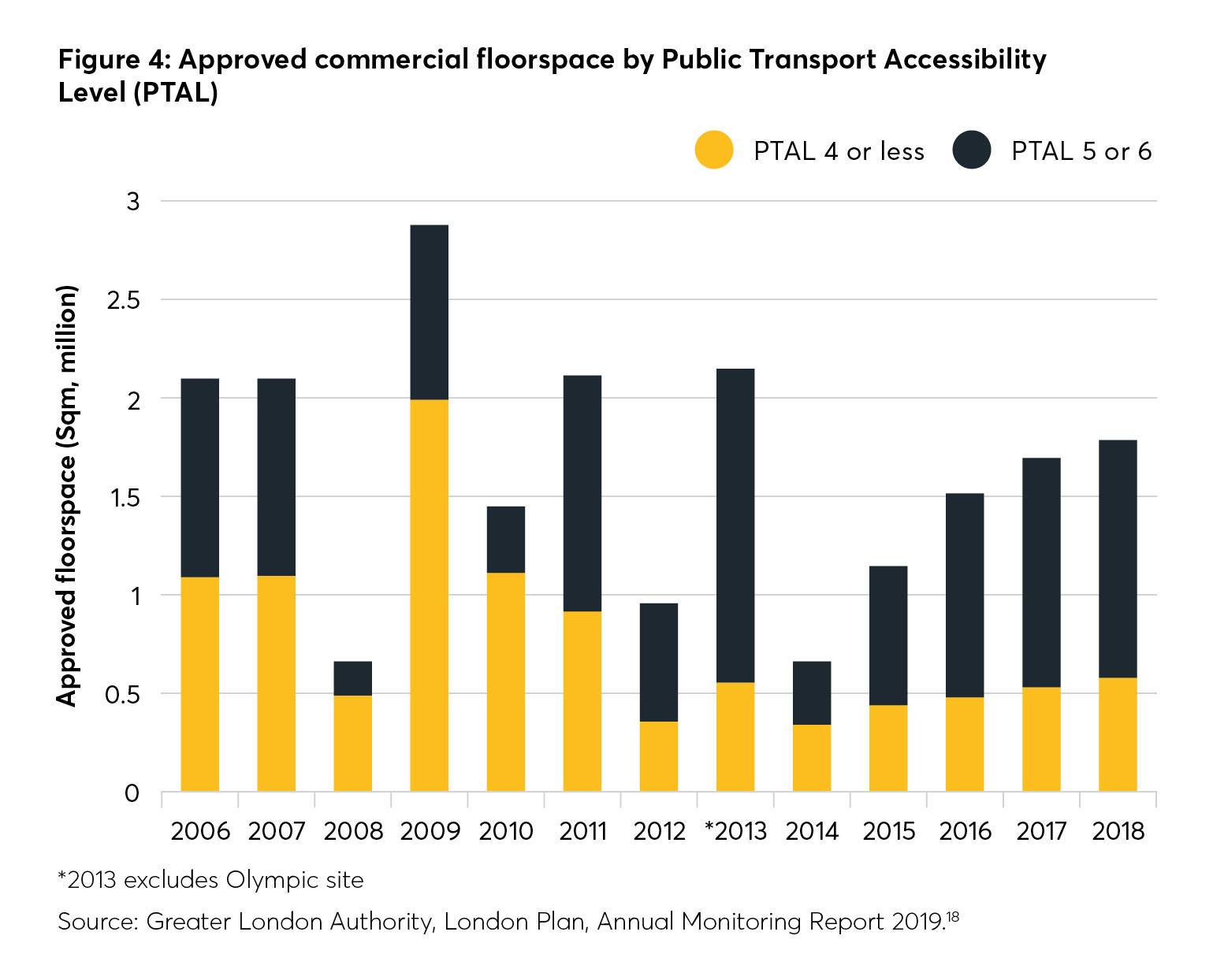 Most new commercial floorspace delivered in recent years has been in areas that are well connected, but this is a recent trend. Between 2006 and 2010, only one-third of new commercial space was located in areas of high PTAL; since 2011 this has risen to two-thirds, as shown in Figure 4. We expect that forces of economic