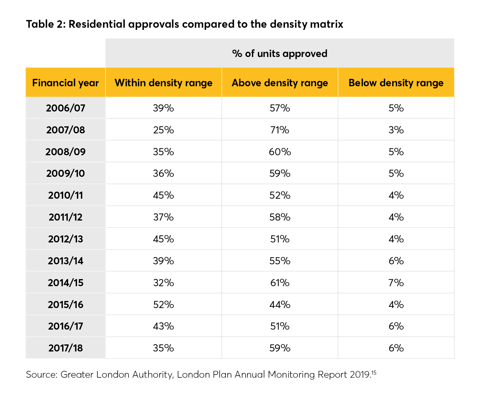 In every single year since 2006, less than seven per cent of developments approved across London have had densities below the London Plan’s expectations, which have been set according to urban form and public transport accessibility levels (PTAL). Instead, developers have been seeking to maximise value by building denser than is recommended in the Plan, as shown in Table 2.