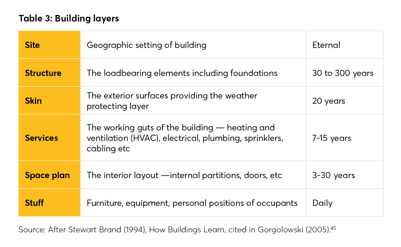 The same applies for building systems for dwellings. The problem can be purely practical – for example, having services too deeply embedded to change easily, or having structural components that do not allow for internal reconfigurations. Adaptable buildings allow for systems to change quickly – and especially those layers that have a shorter lifecycle than the shell and therefore will need to be changed. Table 3, adapted from theorist Stewart Brand, offers a conceptual framework for designing in adaptability.