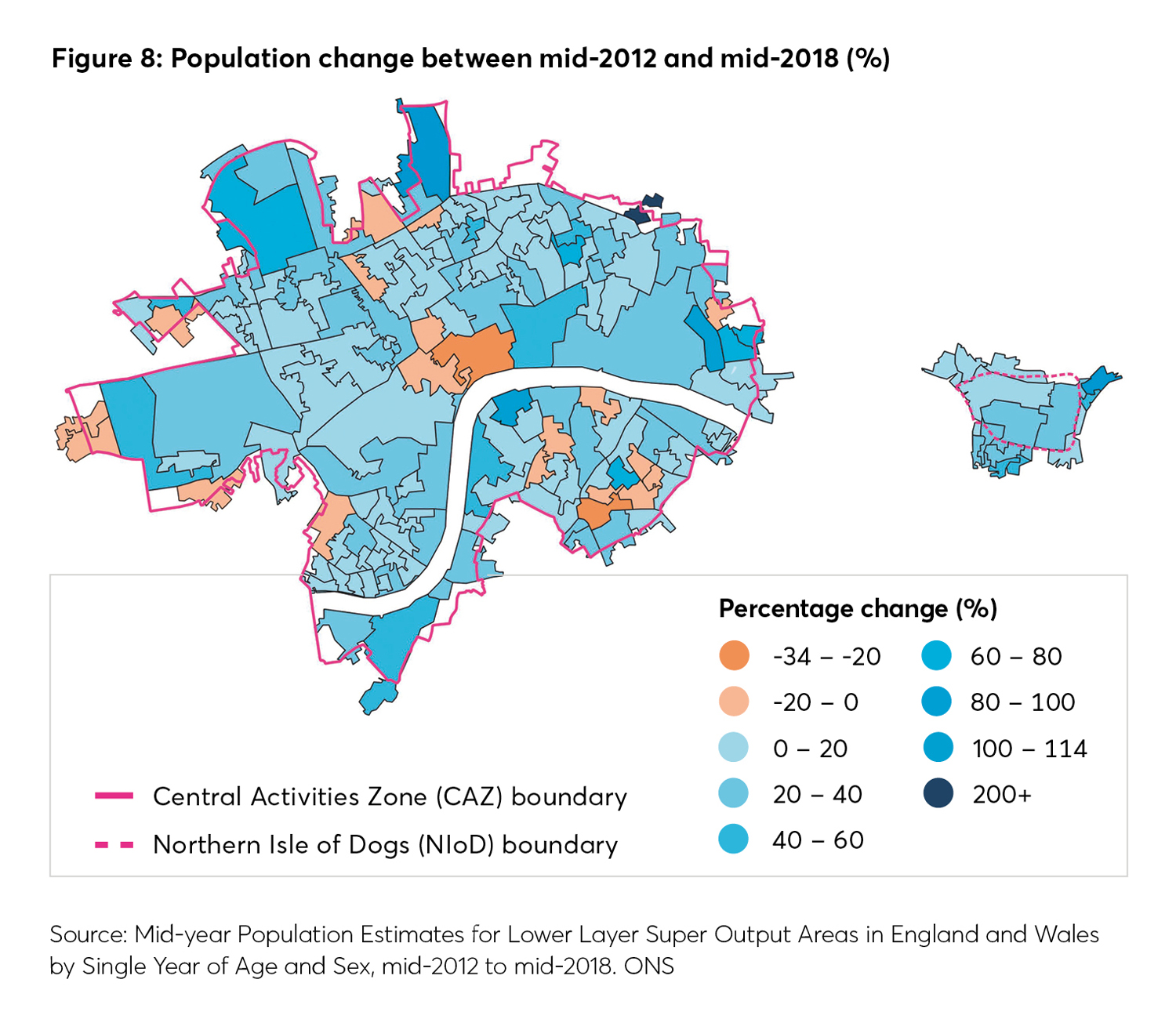 Between 2012 and 2018, the highest population growth in the CAZ/NIoD has been in the Hoxton area (around 200 per cent) and around King’s Cross (140-160 per cent), both sites of significant urban change, albeit of very differing natures. Elsewhere, population has grown steadily across most of the CAZ and NIoD, with some small decreases in parts of Southwark and Westminster.