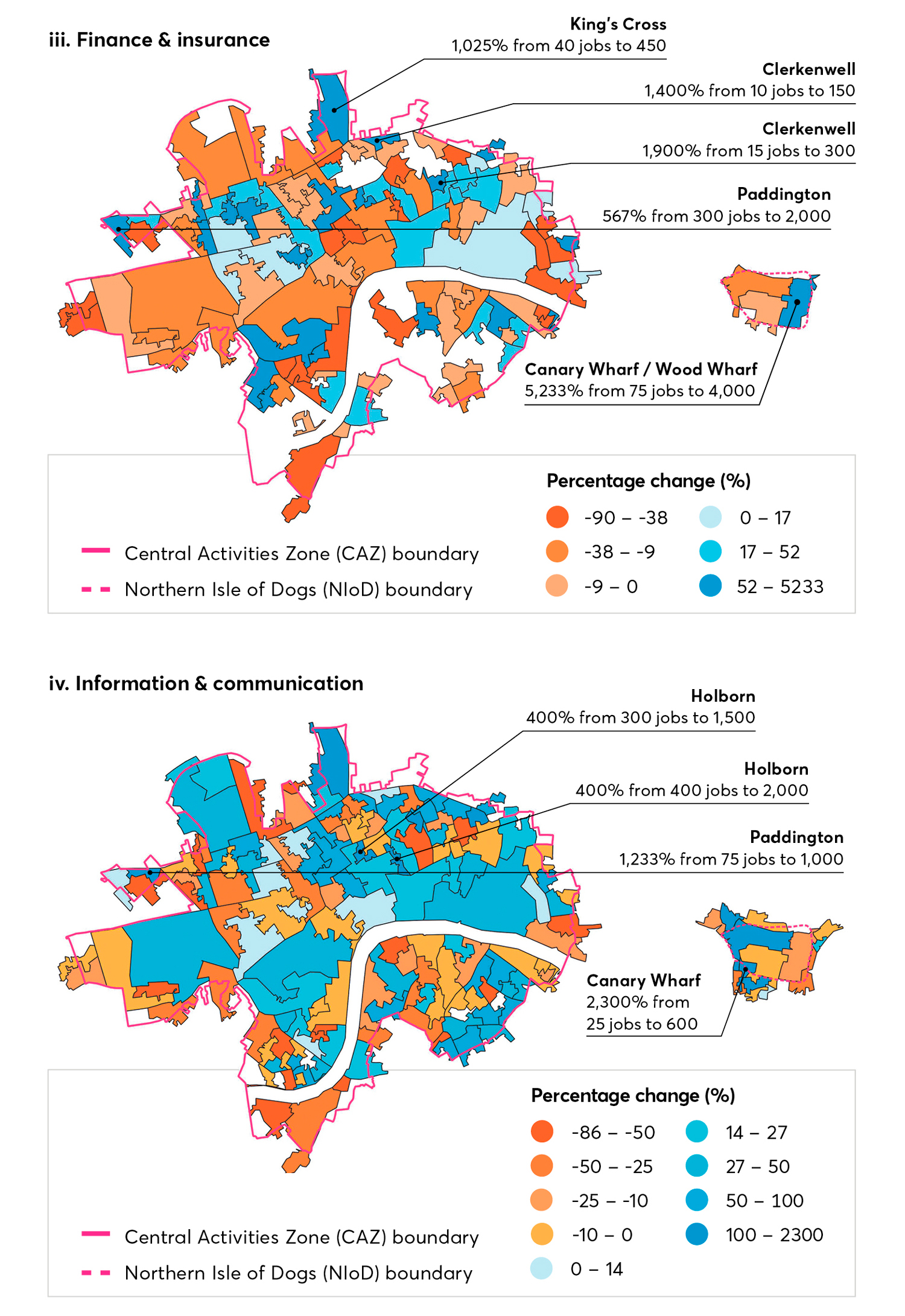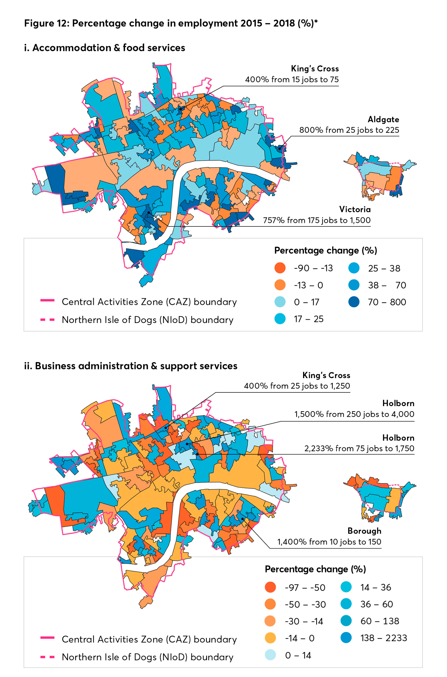 While a few sectors have seen more growth outside the CAZ/NIoD, most became more concentrated within the district between 2015 and 2018. Employment has increased particularly rapidly in some sectors and locations: food and accommodation services have grown significantly around Aldgate and Victoria, while finance and insurance has increased markedly in King’s Cross and particularly to the immediate east of Canary Wharf. Information and communication employment has increased substantially at Paddington, and also at Canary Wharf. It is no coincidence that these areas have also seen significant redevelopment in recent years, whether driven primarily by private or public investment. This has effectively established new clusters within the CAZ/NIoD.