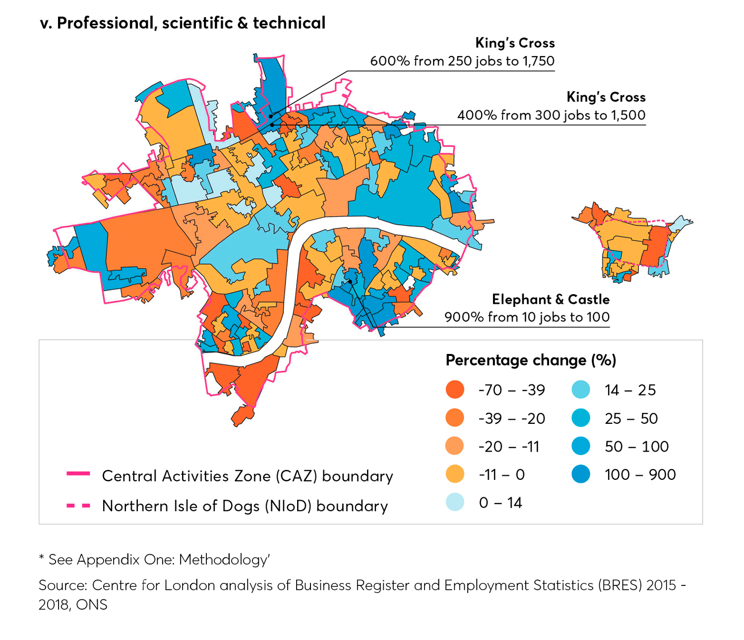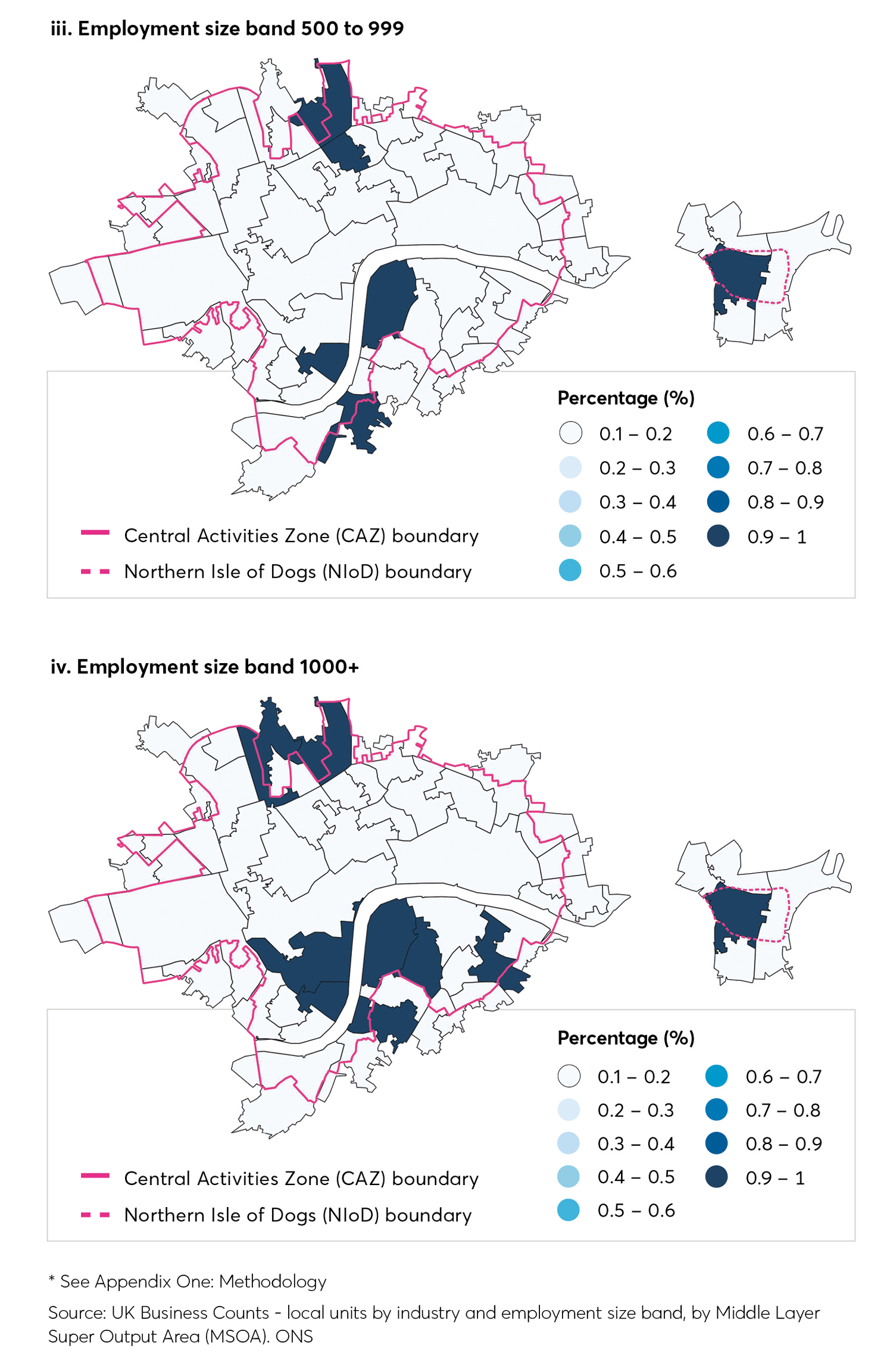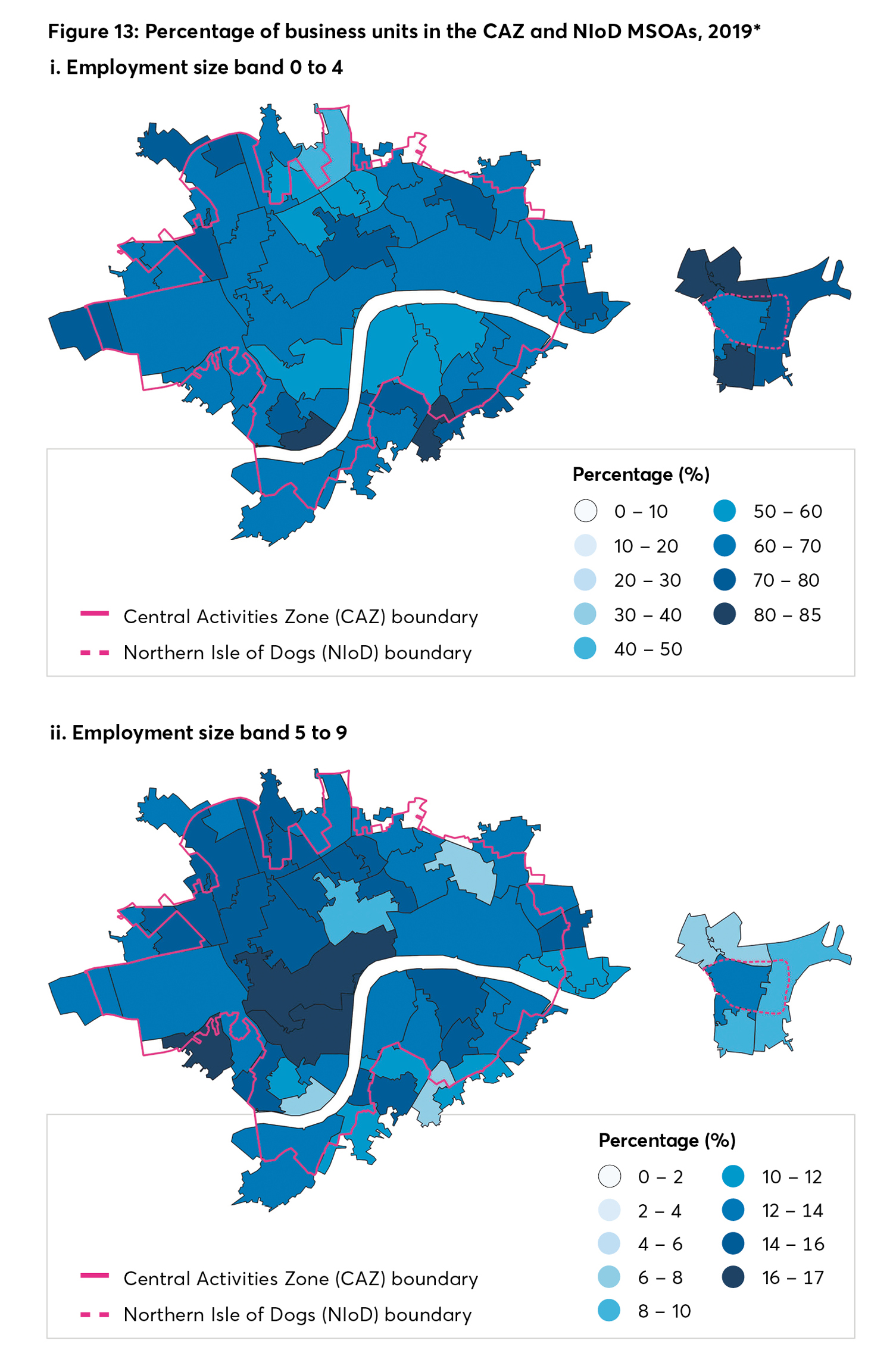 When we compare this picture to that of 2014, the proportion of employment in different size bands tends to follow similar geographic patterns. There are some notable exceptions: in 2014, the highest proportion of 0-4 sized businesses were based near the edge of the CAZ, but the most recent data shows that this gap is closing as more small business space is provided in central areas. 31