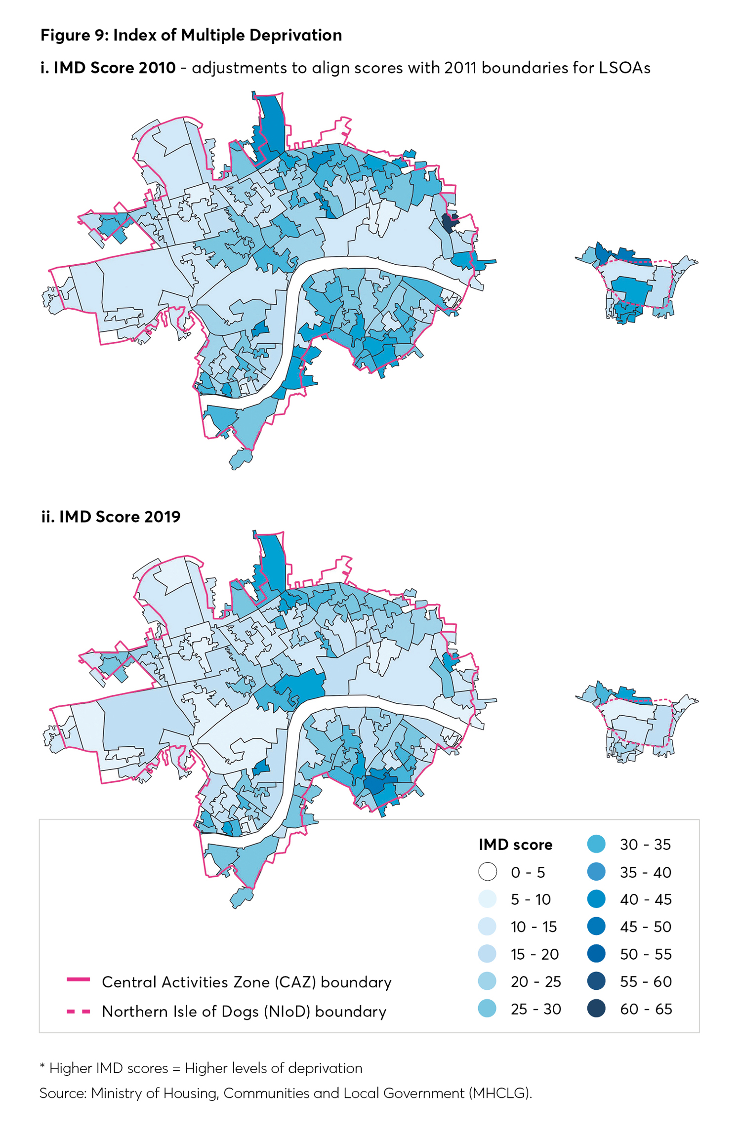 Figure 9 shows relative deprivation at neighbourhood (LSOA) level within the CAZ/NIoD. Despite a decrease in relative deprivation levels across London boroughs between 2015 and 2019, 9 there is still great poverty across parts of the capital, including the CAZ/NIoD.