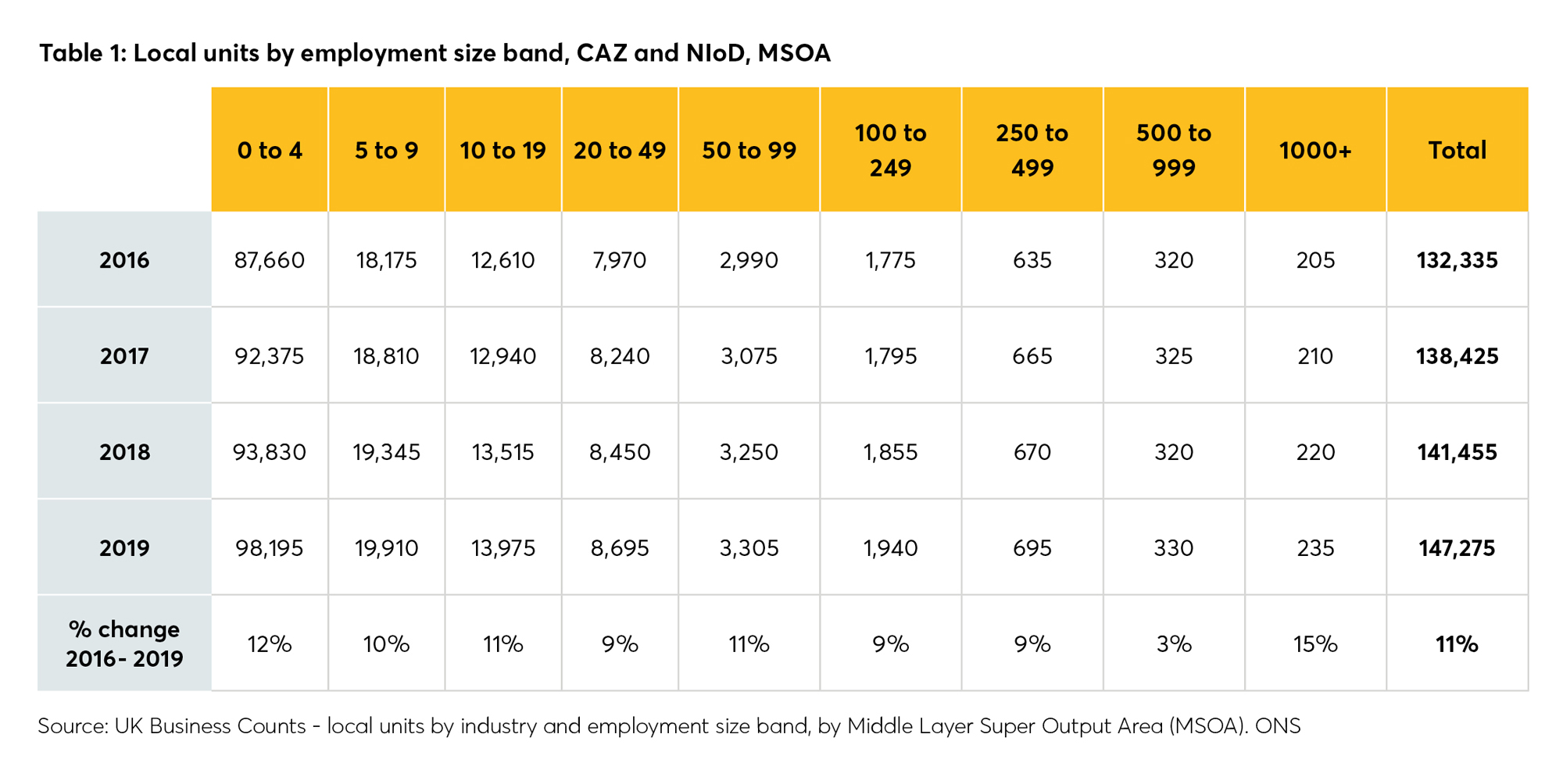 The size of employers in the CAZ/NIoD is different to the rest of London, and has also shifted in recent years. The smallest business units (employment size band 0-4) occupy the highest share of overall units in the CAZ, although the largest employers employ more people overall. Between 2016 and 2019, growth in the CAZ/NIoD has been highest amongst both the smallest and largest business units (0-4 and 1000+), as Table 1 shows. However, at a citywide level, the number of business units employing 0-4 people grew by five per cent between 2016 and 2019, while numbers of all other unit sizes fell considerably (by up to 39 per cent). A London-wide decline of two per cent in business units of over 250 employees also contrasts with the positive growth rates in larger business units in the CAZ/NIoD shown below. This highlights the continued dominance of larger units in the district, alongside the faster-than-average growth in the smallest business units. 27