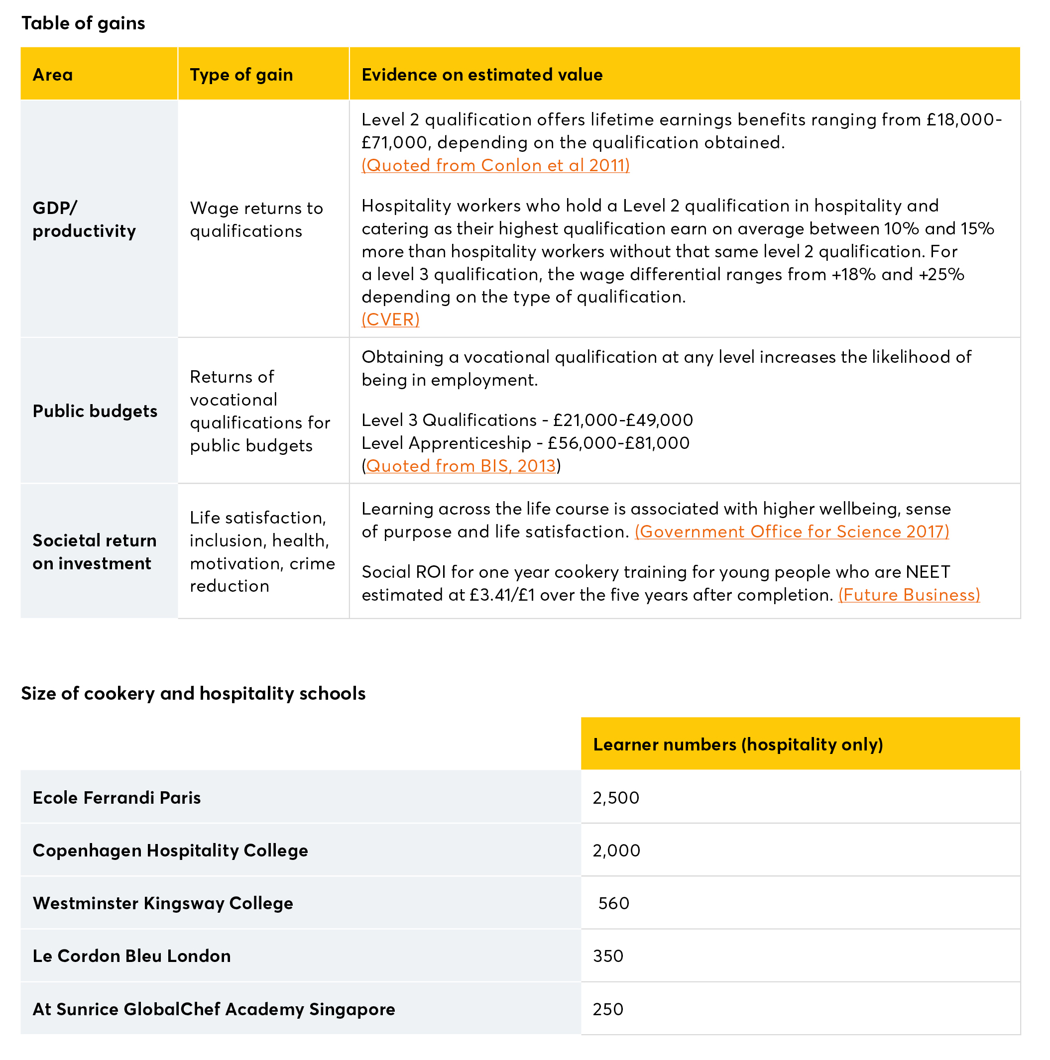 We believe the College of Food could help train and educate a new generation of skilled chefs. Although it is not within our remit to quantify the benefits that would result, the table below offers a review of existing studies, which provide a rough estimate of the positive returns that the College of Food could expect to generate.