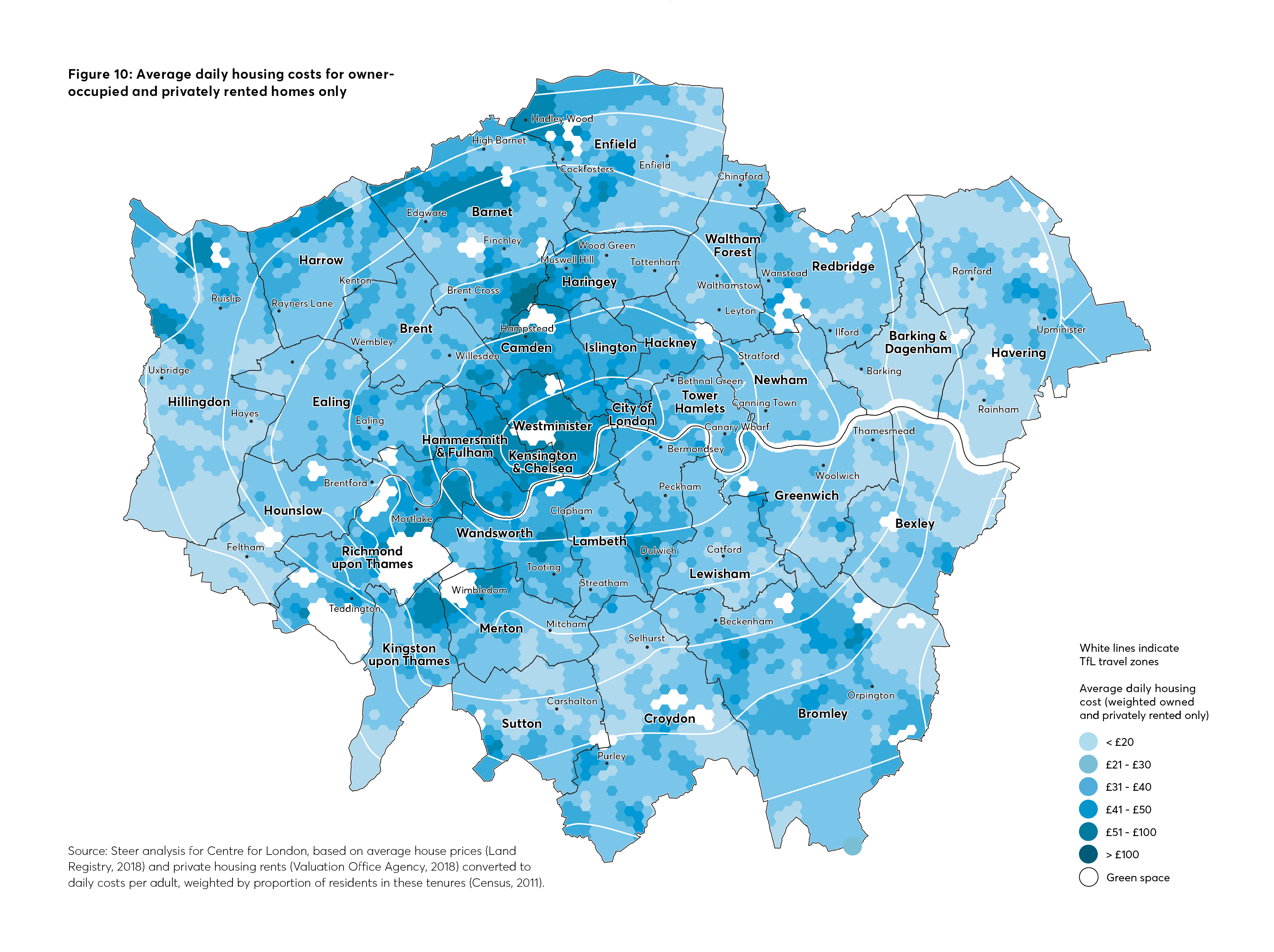 Figure 10 maps average housing costs in owneroccupied or privately rented homes. We have excluded social rented homes for the reason that many Inner London boroughs have much higher rates of social housing, but access to it is limited: this therefore masks the real costs that someone looking to move to an area would be considering. The analysis shows that housing costs are highest in areas like Westminster, Kensington and Chelsea, Kingston upon Thames, Wimbledon and Hampstead, where there are high concentrations of highvalue privately owned housing. Outer London generally has lower house prices than central and Inner London, although areas in north-west Outer London have comparatively high costs.