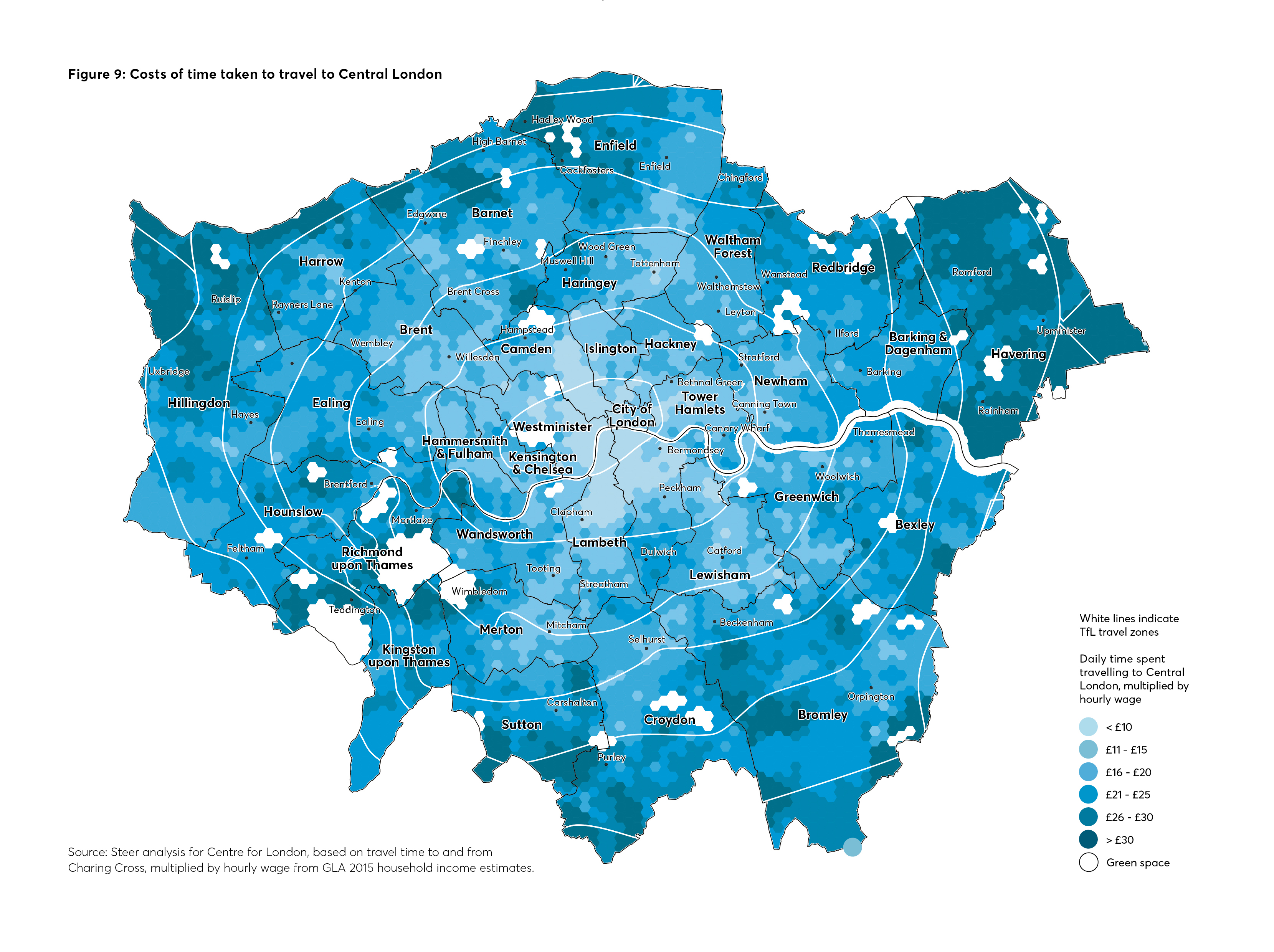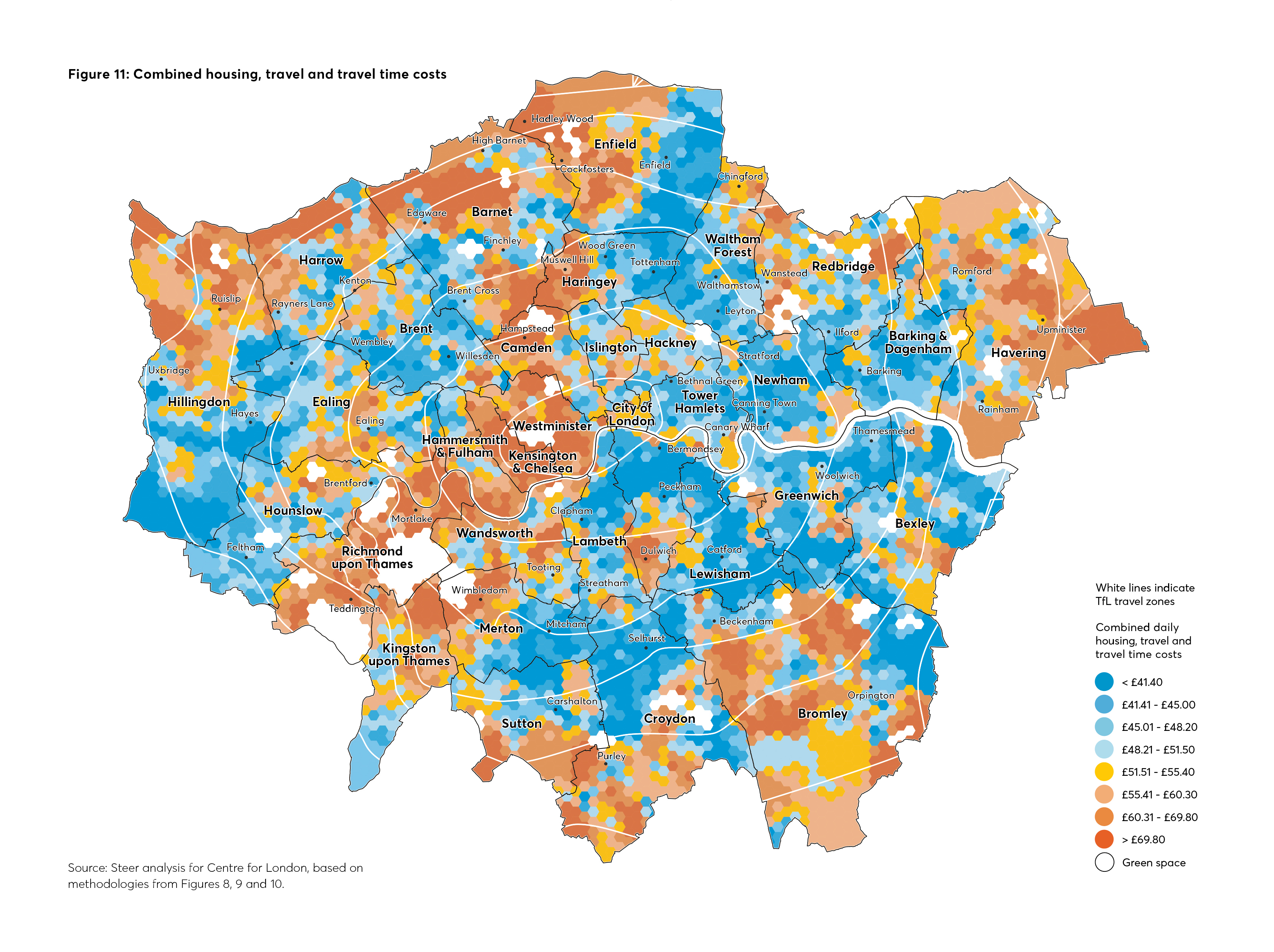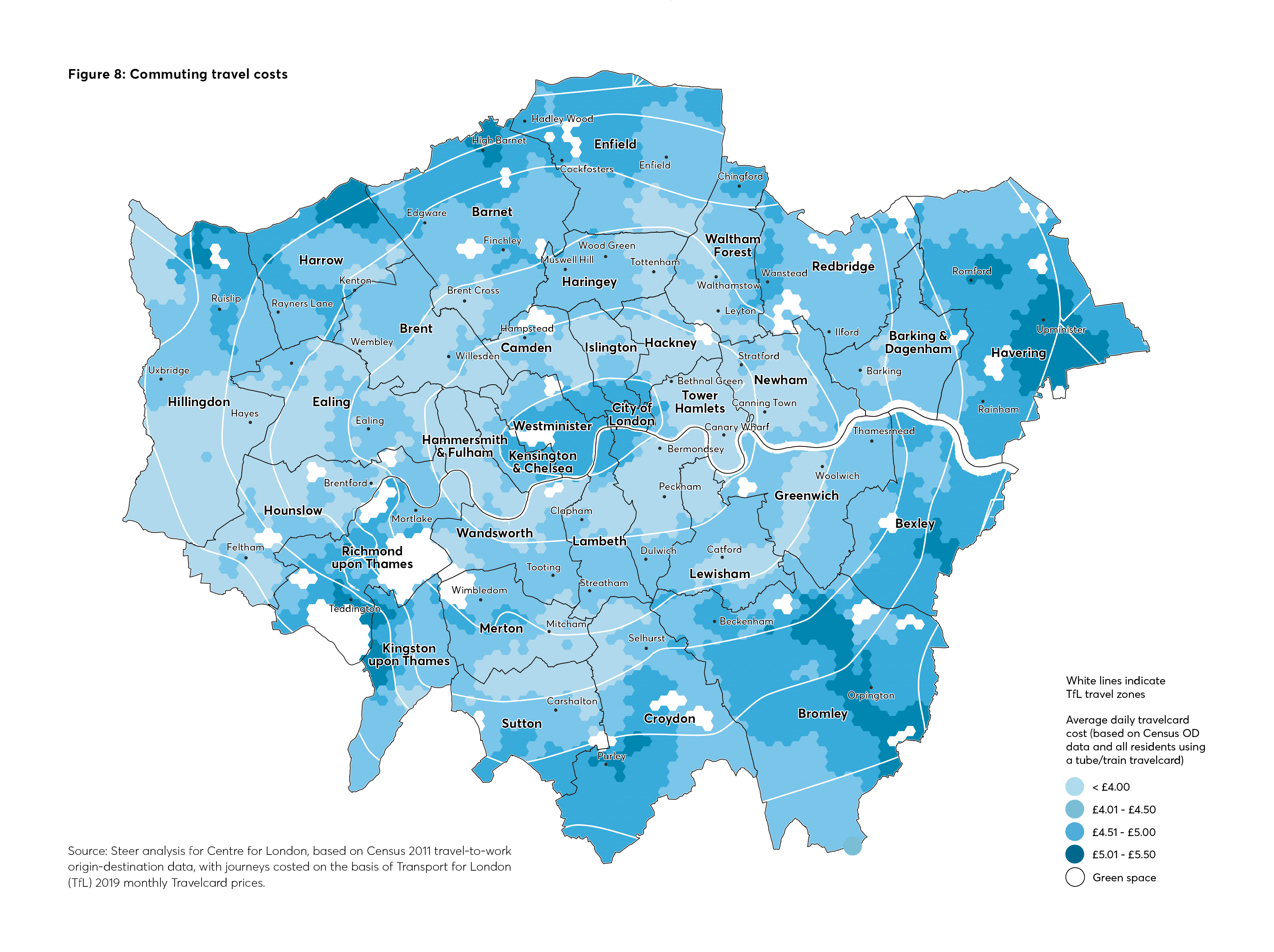 Figure 8 maps the average costs for regular commuters’ journeys to work, based on the monthly Travelcard costs for the average distance travelled to work by residents from a given area. This assumes that all commuters travel by public transport and use monthly Travelcards (although we recognise that many travel by bus, car or other modes of transport – and that many journeys are made for other purposes).