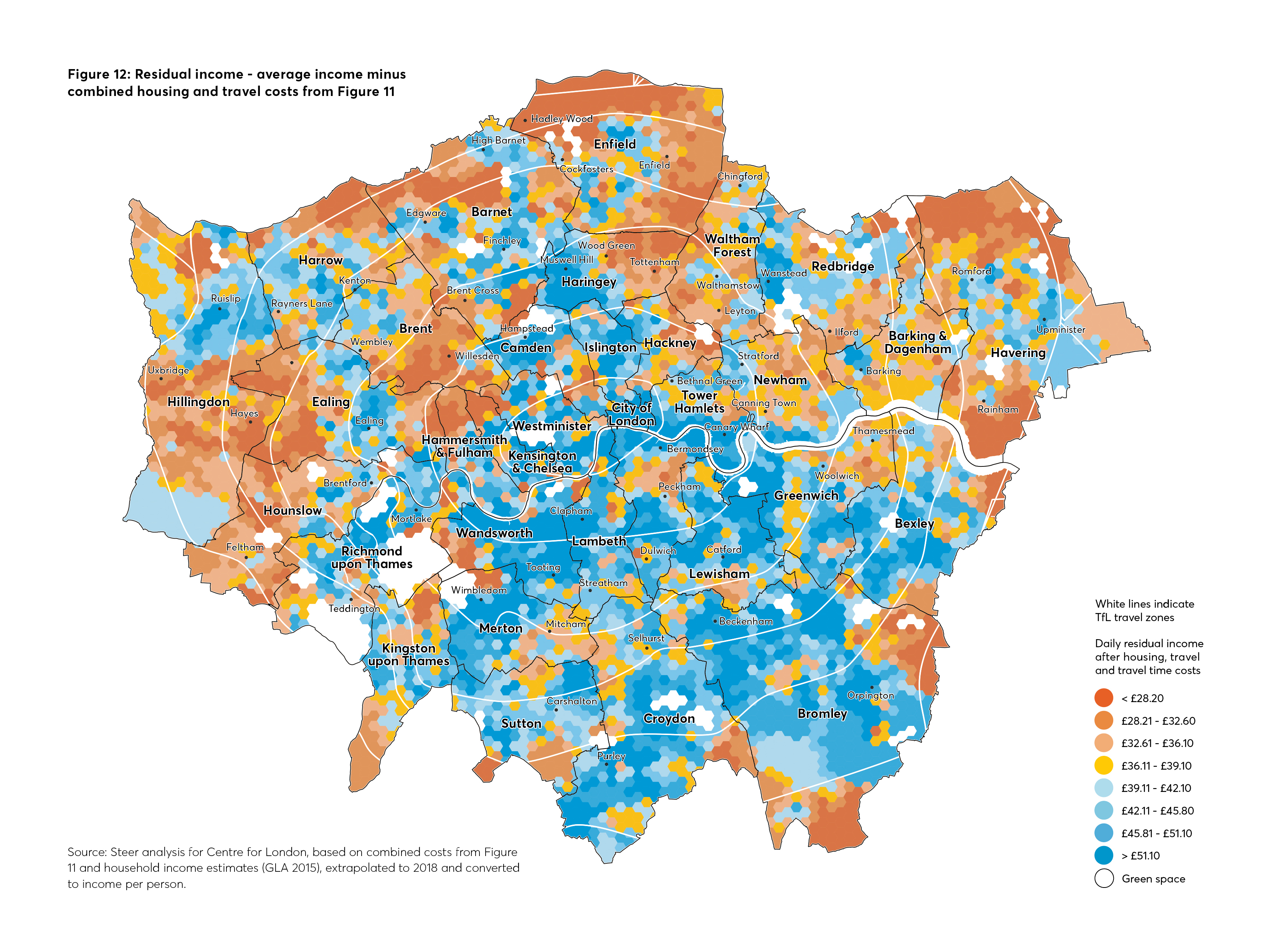 Figure 11 adds the costs of travel, travel time and housing together to show an overall measure of cost, and Figure 12 then subtracts these from average incomes to show residual incomes. The analysis reveals some interesting differences, with relatively high-cost and low-cost places quite close to each other across London. These findings suggest that living costs in London are not simply a story of Travelcard zones, distance from the centre or even Inner versus Outer London. The picture is much more complex, with a patchwork of costs across the capital.