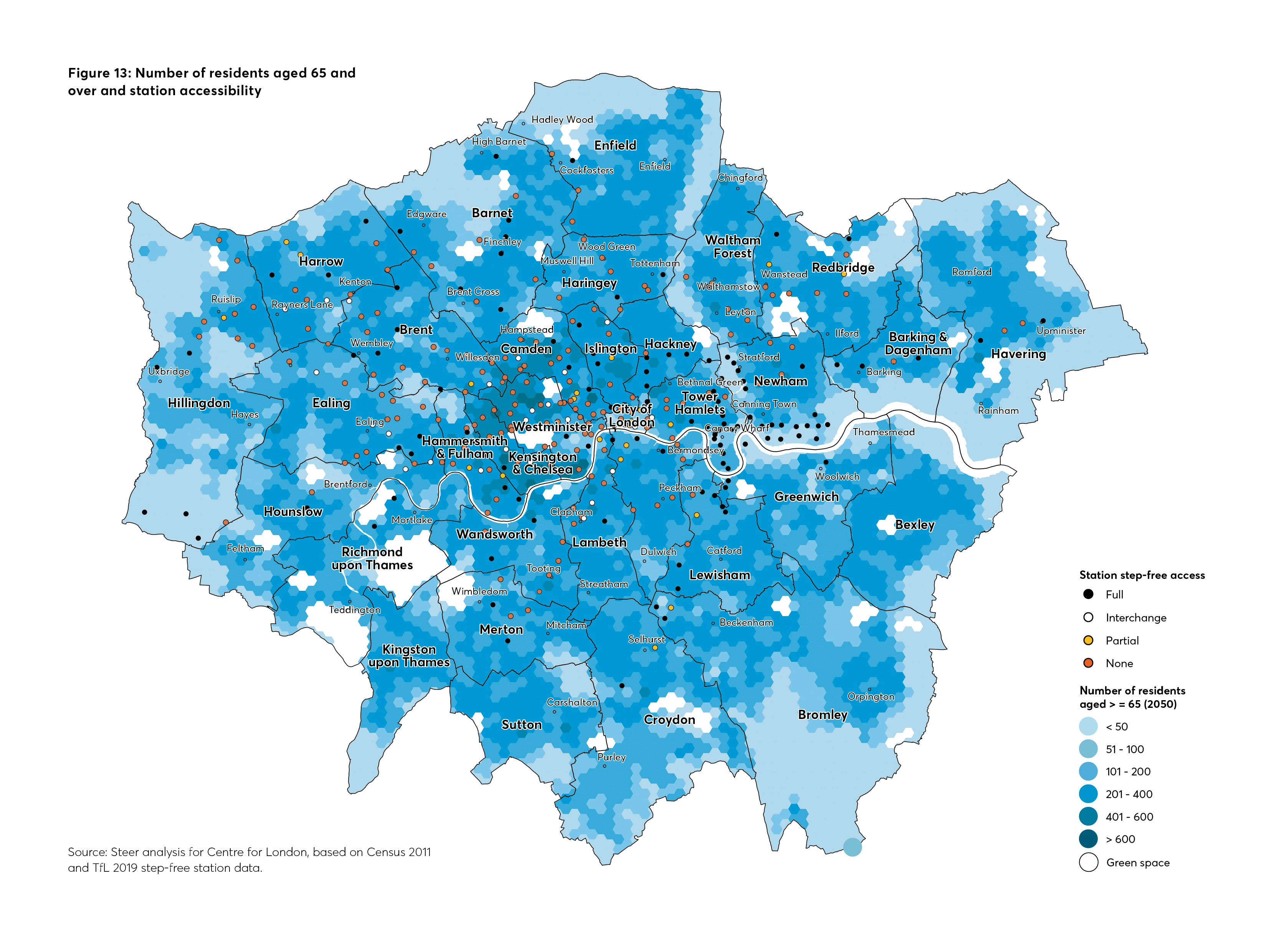 Mapping current concentrations of older residents against station accessibility shows that large numbers of older residents can be found in central and Inner London – where stations with no step-free access predominate (see Figure 13) – rather than in areas such as Docklands, where the DLR and Jubilee line offer better accessibility.
