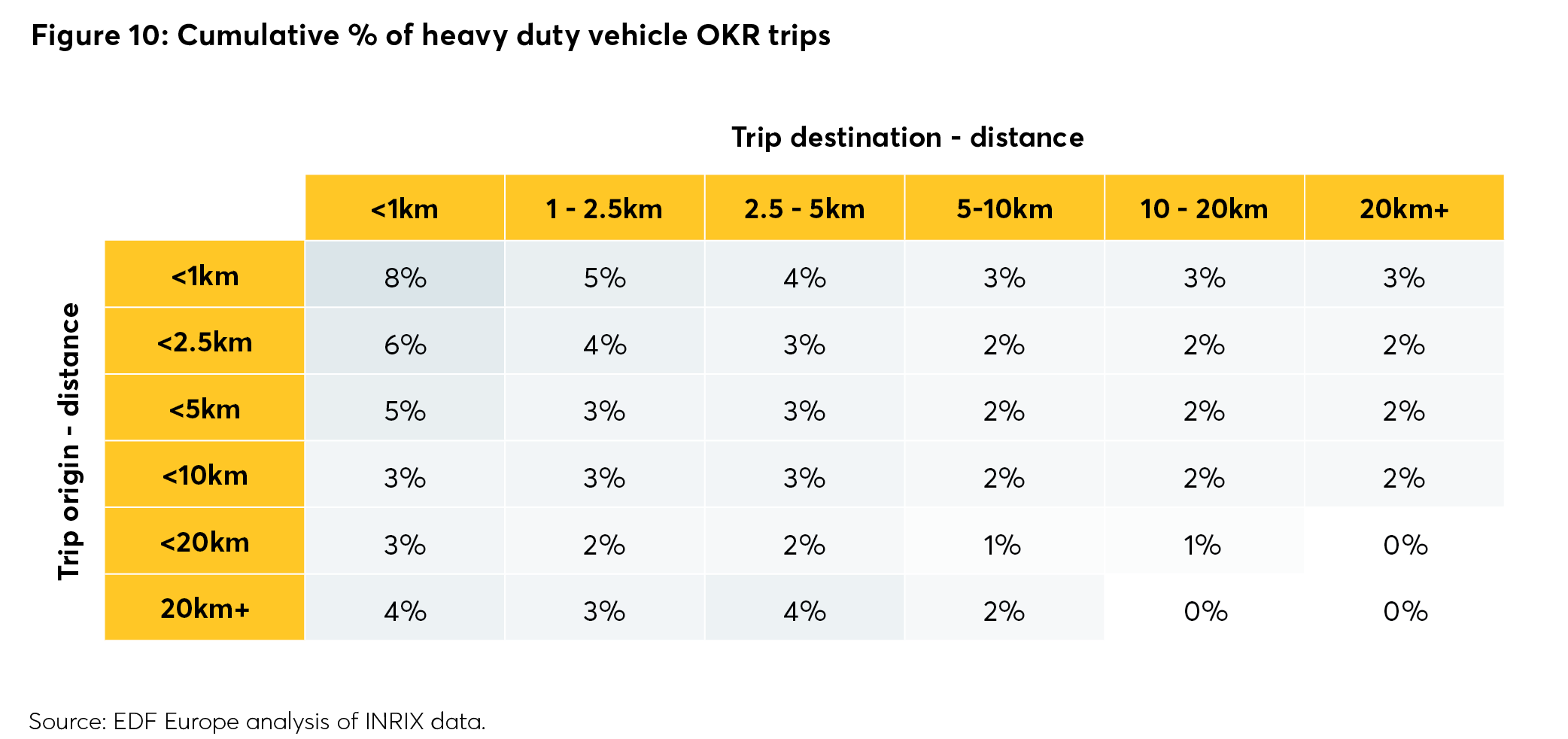 As set out in previous chapters, freight journeys are very diverse in terms of distance, purpose and vehicle type – and so different air pollution mitigation measures will work for different types of trips. Data analysis provided by the Environmental Defense Fund Europe offers information on heavy goods vehicles using the Old Kent Road from a sample of 7,100 trips made by goods vehicles on the Old Kent Road during the week of 9-15 September 2019. All trips used in this analysis were made by HGVs, which are estimated to make up 29 per cent of total miles travelled by freight vehicles on the Old Kent Road.