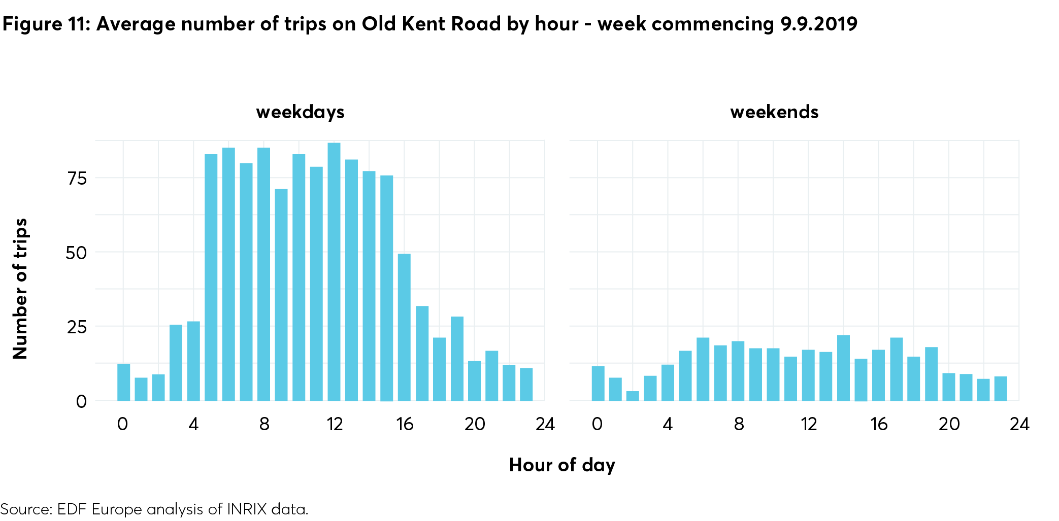 Vehicle journeys mostly take place on weekdays between early morning and mid-afternoon, with fewer trips in the late afternoon, evening, night time and at weekends. Local trips peak around midday, while external trips peak during the early morning rush hour. There is an opportunity to retime deliveries for later hours when there are fewer pedestrians or cyclists on the roads, in order to reduce exposure to air pollution.