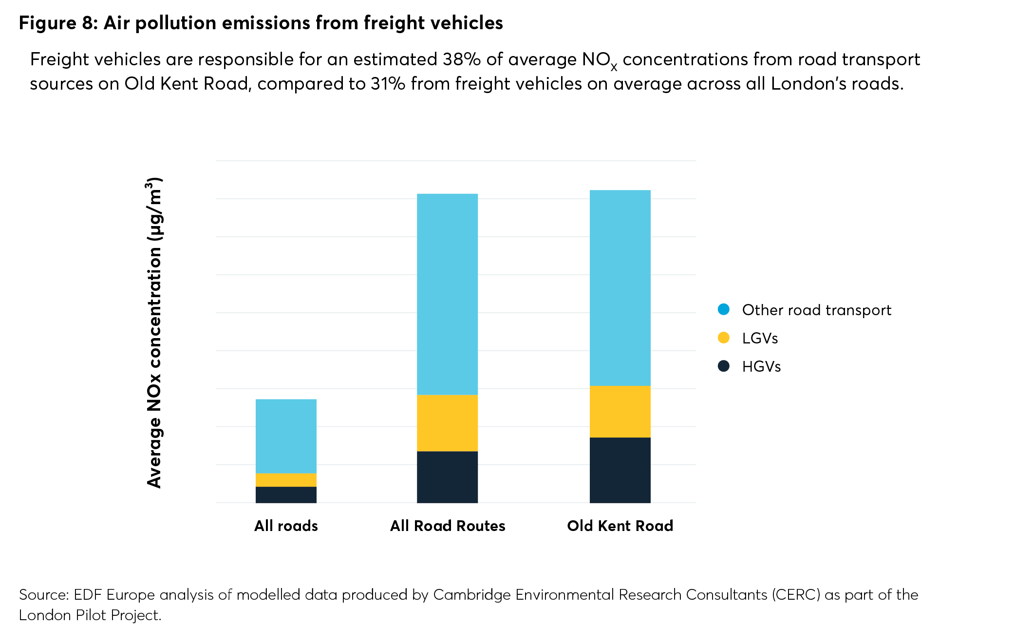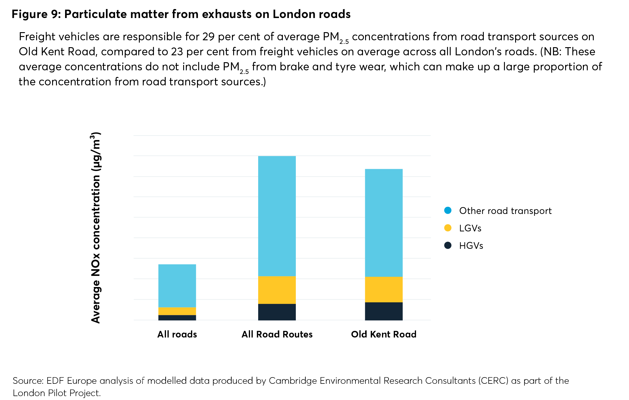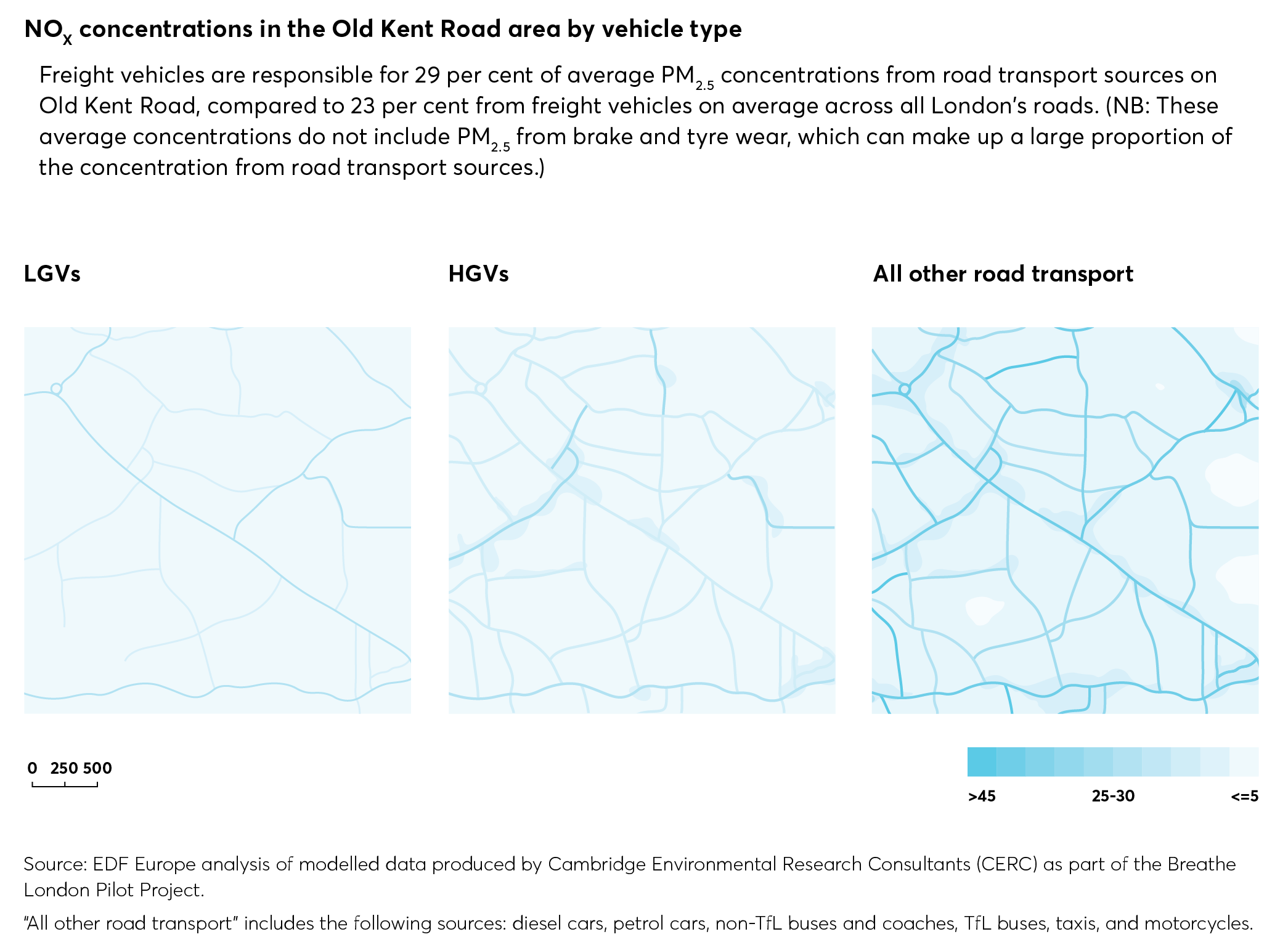 Freight vehicles are responsible for 29 per cent of average PM2.5 concentrations from road transport sources on Old Kent Road, compared to 23 per cent from freight vehicles on average across all London’s roads. (NB: These average concentrations do not include PM2.5 from brake and tyre wear, which can make up a large proportion of the concentration from road transport sources.)