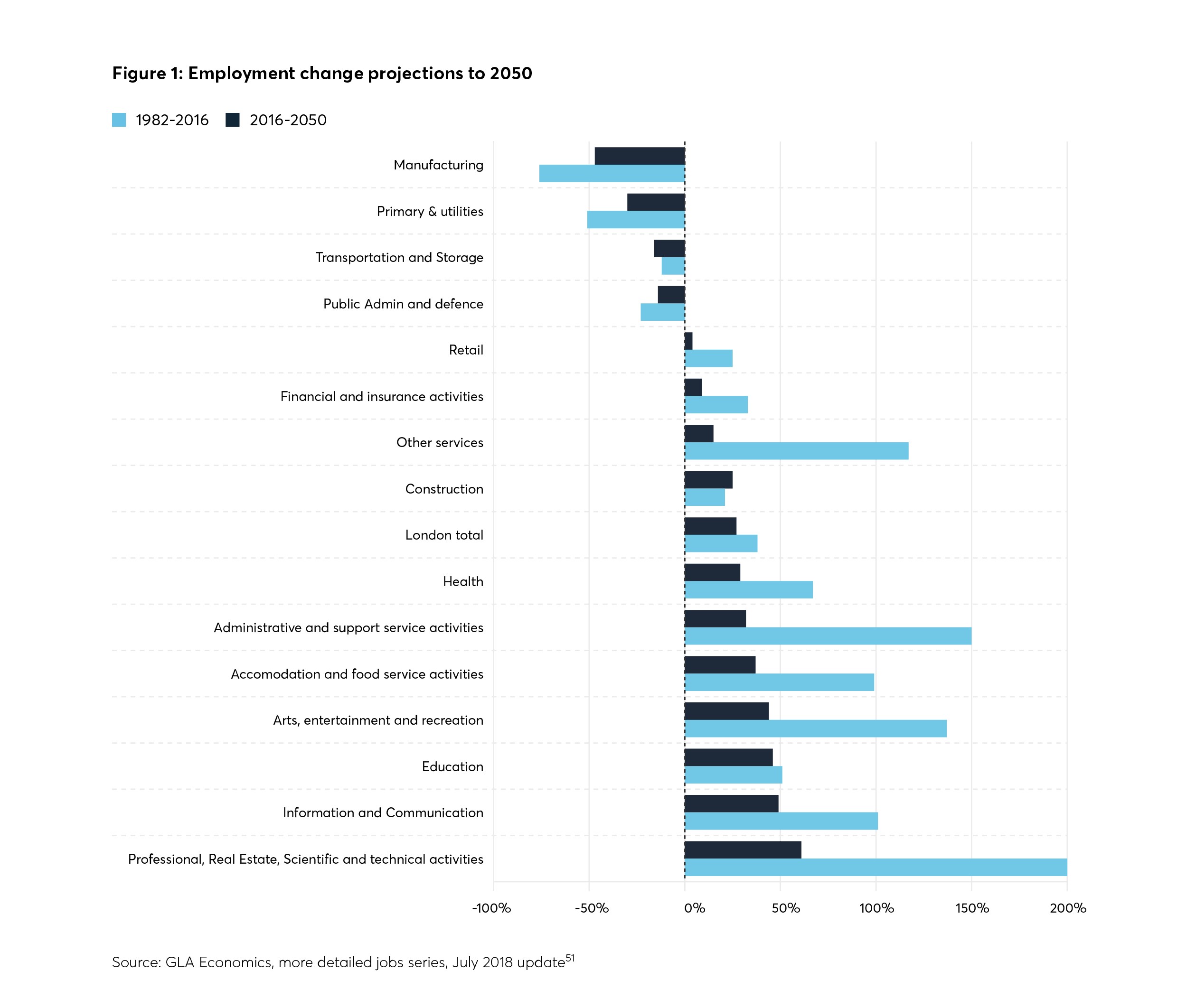 According to projections produced by the Greater London Authority, the growth in employment that London has experienced in the last 30 years is expected to persist during the next 30, albeit at a slower pace 9. The GLA expects little change in the sectors driving employment growth: the professional services, information and communication, culture and hospitality sectors will continue to expand, while the decline in public administration jobs and some industry (such as manufacturing) is expected to continue – though not as pronounced as before.