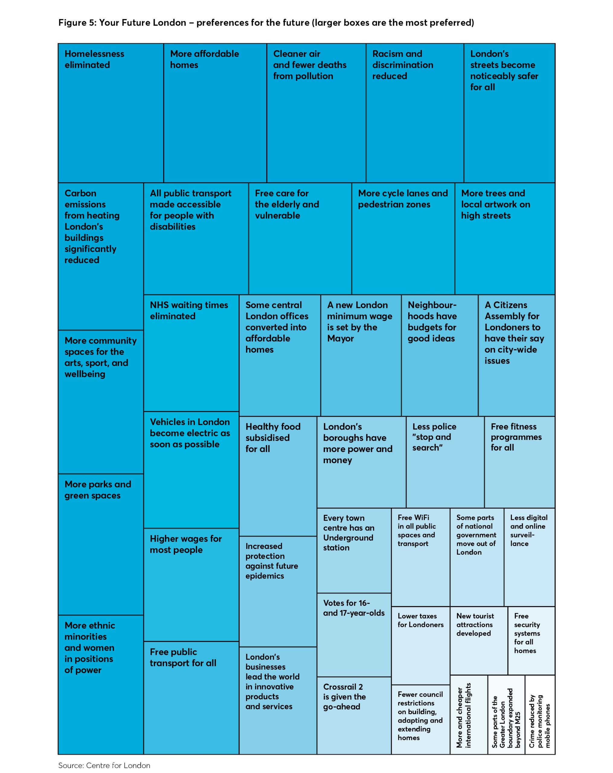 In this chapter, we draw largely on the results of public polling carried out specifically for this project, and on feedback from our Your Future London online engagement. (See the Appendix for more information on both.) Far more data was collected than we can share in this report, and more detailed data tables are available in the report supplement. Our research was informed by a vast range of data and information from a variety of other groups and sources.