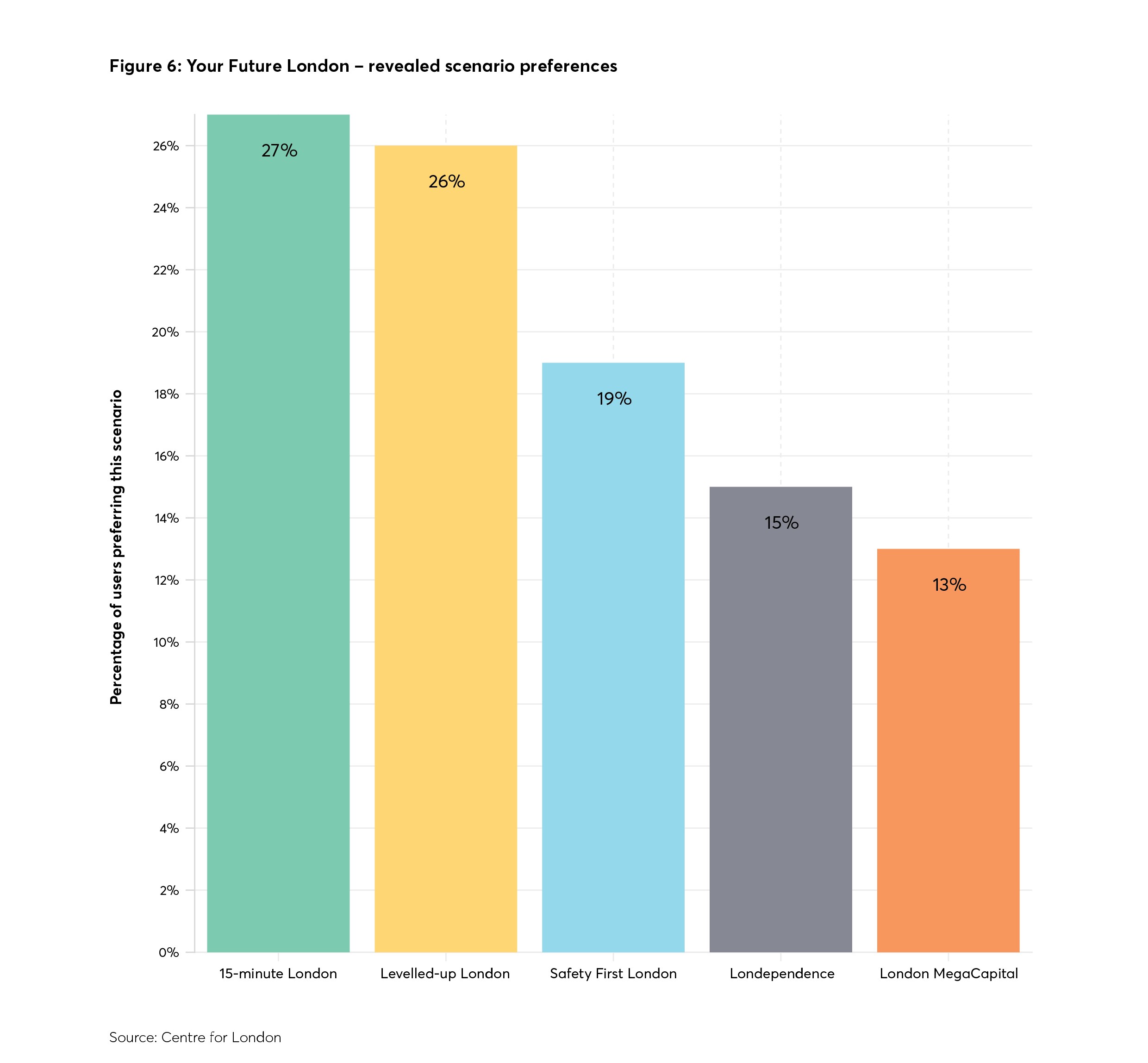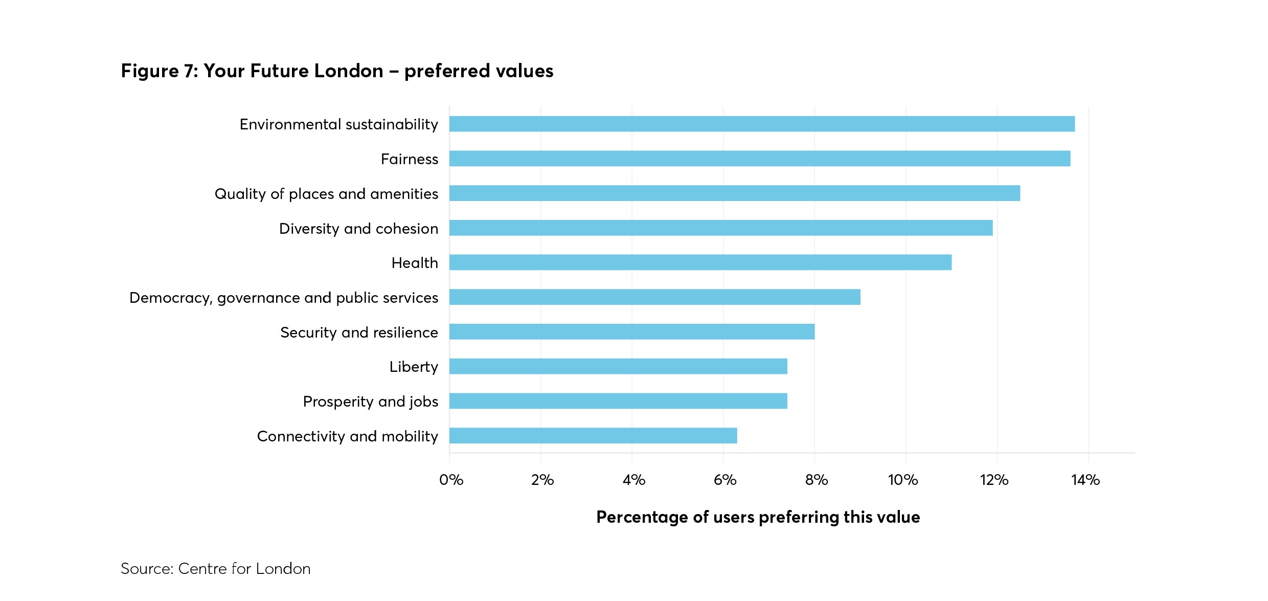 We linked the statements in Your Future London to the future scenarios we developed in London at a Crossroads – which in turn were built from pairs of values in our initial framework for the project. This allowed us to compare broader expressions of values and possible futures for our city. When we broke them down in this way, the strongest values expressed through people’s preferences were environmental sustainability and fairness, followed by quality of places and amenities. These related most closely to the “Levelled up London” and “15-minute London” scenarios, although there was some support for all five scenarios we developed.