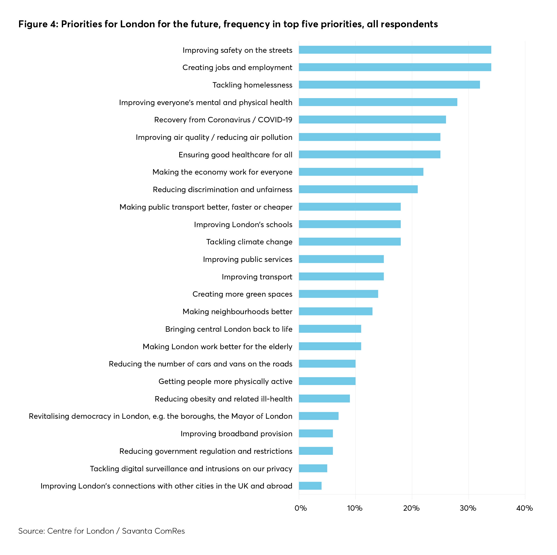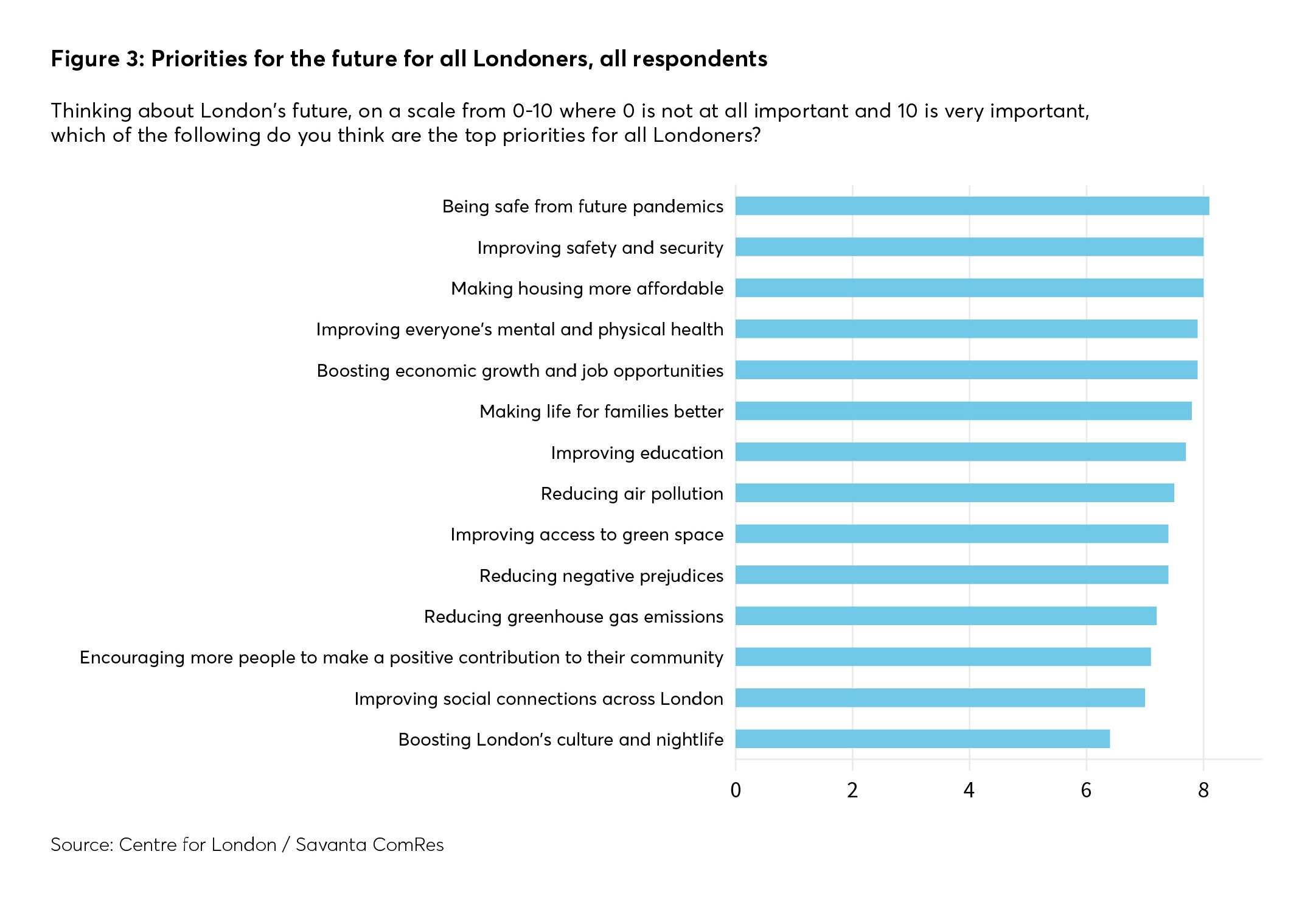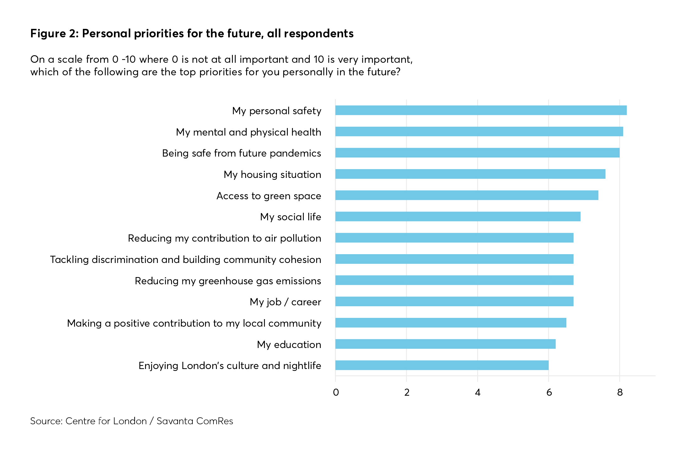 We asked Londoners to tell us which issues mattered to them the most from a defined list. The issue they ranked highest overall was “my personal safety”, with an average of 8.2 on a 0 to 10 scale. Strikingly, this was the either the highest or joint-highest ranking response for men and women, White and BAME Londoners, homeowners, renters, and all age groups from 25 to 64. (For 18- to 24-year-olds, “my mental and physical health” was marginally higher, and for those 65 and over it was “protection from future pandemics”.) Although their comparative rankings were the same, the average score given for personal safety was higher for women than for men – perhaps reflecting concerns about gender-based harassment and violence given that the poll was taken shortly after the murder of Londoner Sarah Everard. We lack time-series comparison data for this question, so it is hard to say how responses have changed, but it seems likely that the coronavirus pandemic has increased Londoners’ concerns about safety. This is reflected in the vision for the city set out in the early part of this report, with its focus on protections. As individuals and as a society, we cannot function at our best when we are frightened, so helping people feel safe is at the core of what we need from our city.