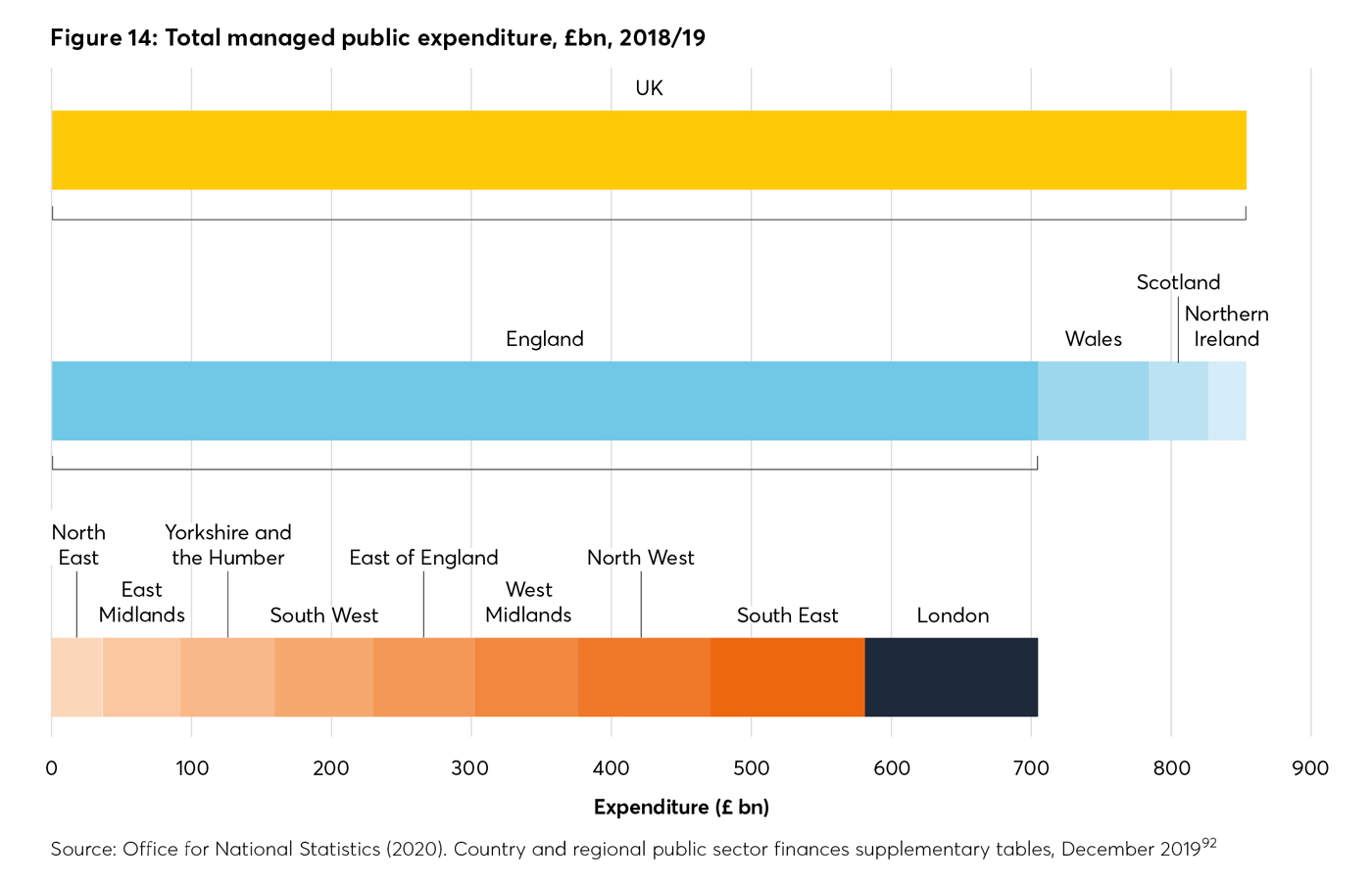 However, there are two important caveats. First, whilst London “pays in” considerably more than it receives from the public purse, both figures are high. London gets the third-highest share of overall public expenditure of any UK region, as Figures 13 and 14 show. HM Treasury may receive a better return on investment in the capital than anywhere else – but London’s highly visible and expensive new infrastructure, from Crossrail to the Olympic Park, also breeds resentment.