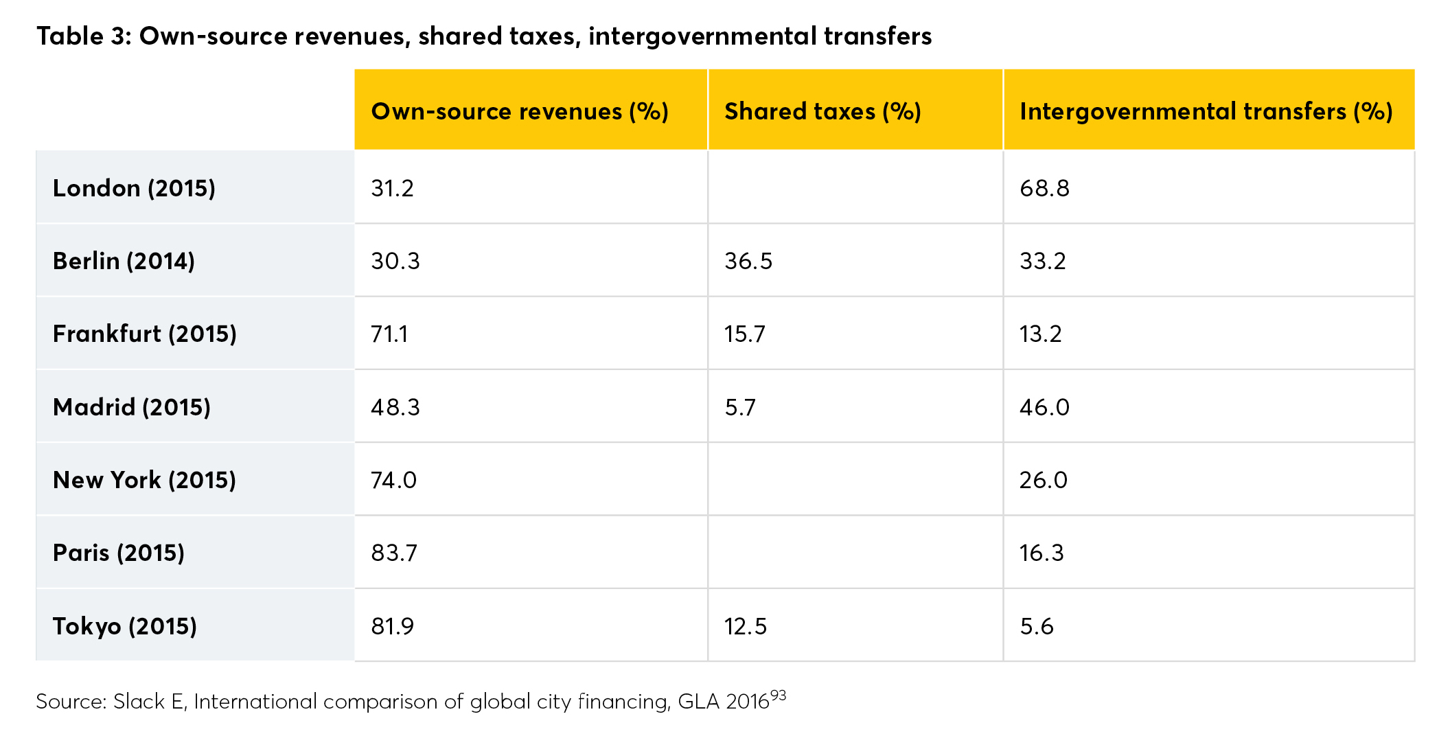 One final factor further complicates this picture. Whilst London receives a sizeable share of public expenditure in return for its (much larger) tax take, its citywide government has little say over how this is spent. Table 3 demonstrates how reliant London is on central government grant (“intergovernmental transfers”) compared to its international competitors – a consequence of London government’s limited tax-raising powers.