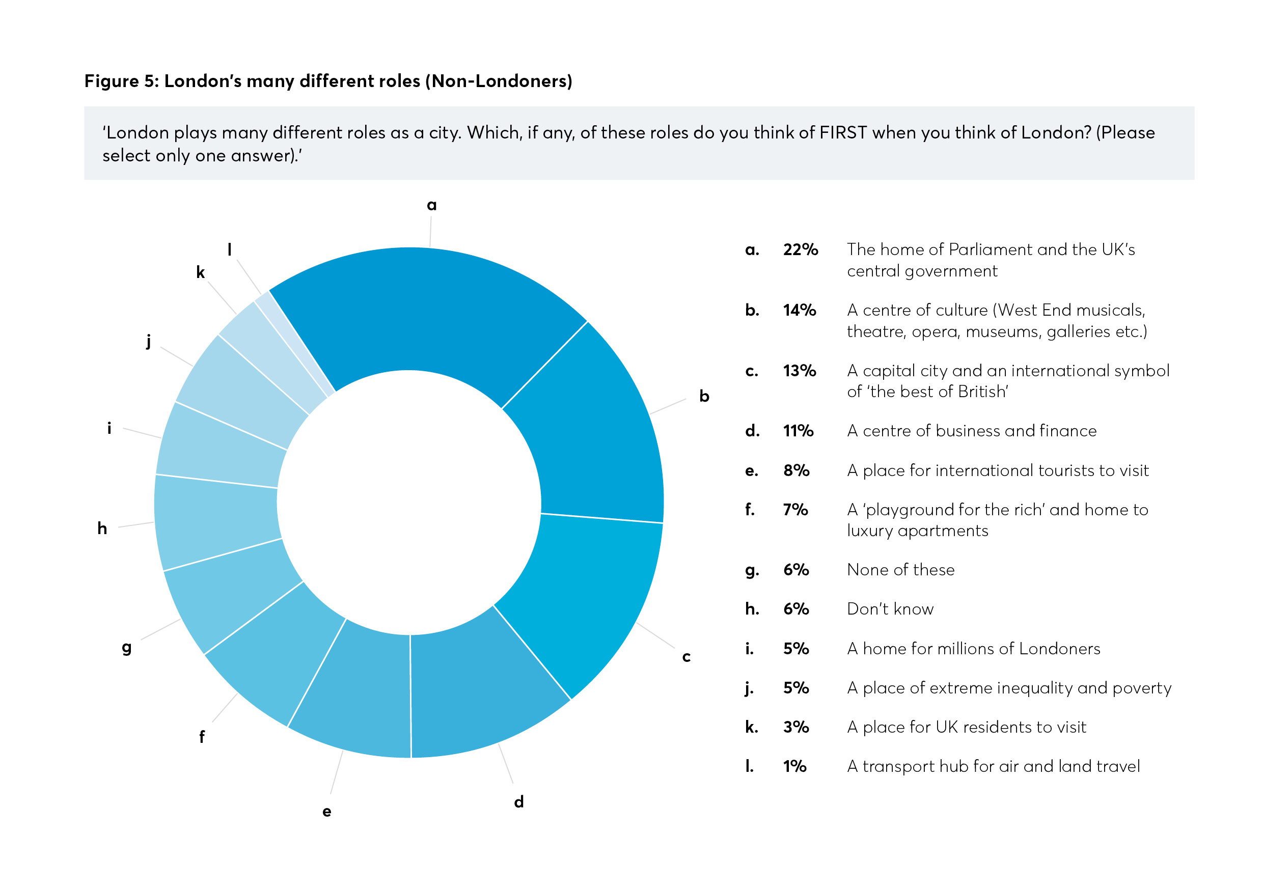 We began by testing which of the capital’s many roles first comes to mind when Londoners and non-Londoners think of ‘London’. As Figure 5 demonstrates, for those outside of the capital, London’s role as the seat of national government was the number one result by some margin, with its cultural offering (West End shows, national galleries and museums) and its role as a capital following, albeit some way behind. However, if we look only at those non-Londoners who visit London once a year or more, ‘centre of culture’ comes first (20 per cent), with national government falling to third (17 per cent) after London’s role as the capital of the UK (18 per cent). Londoners, on the other hand, think of London primarily as the UK’s capital city (19 per cent), and as a home to Londoners (18 per cent) Despite being home to the majority of national cultural institutions and sports venues, just 3 per cent of non-Londoners thought of the capital as a place for UK residents to visit.