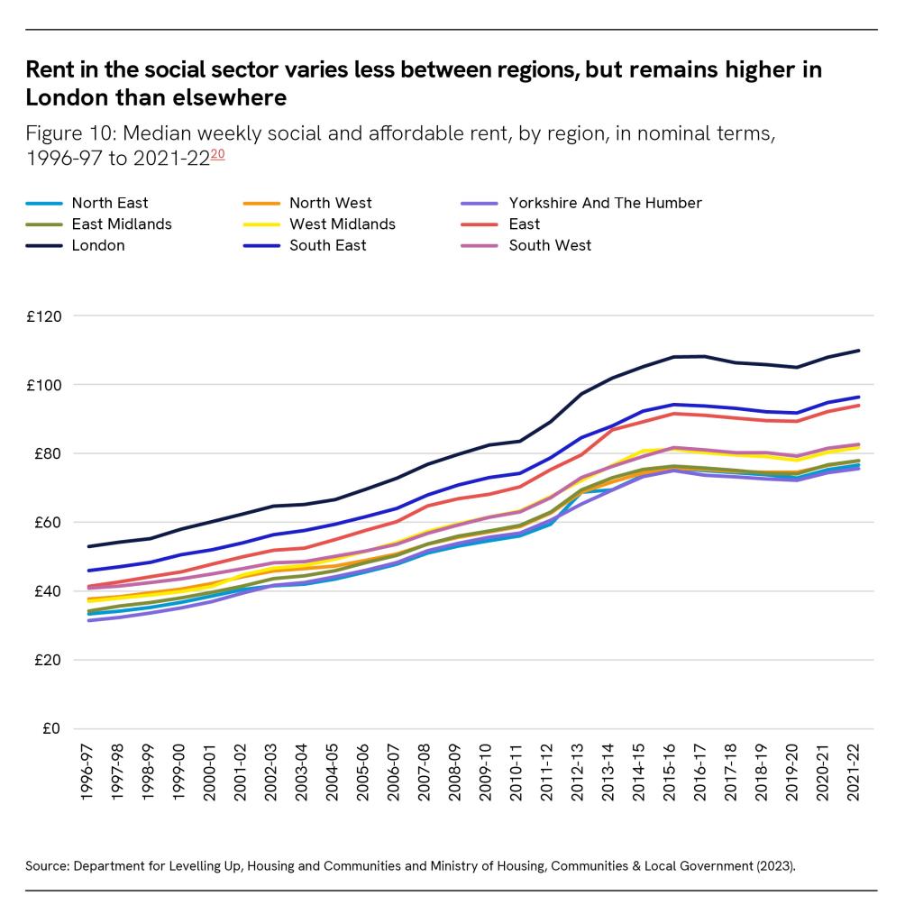 From 1996 to 2022, London has remained the region with the highest local authority weekly rents. However, weekly rents in London have increased by a smaller proportion over this time compared to other regions, and in 2021-22, London’s rents were just over 20 per cent higher than the average across England, compared to nearly a third higher in 1996-97.
