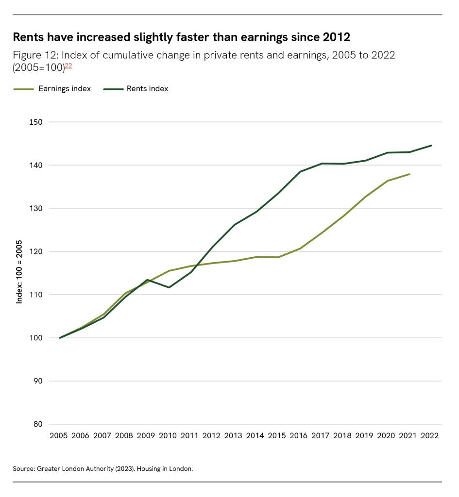 This data suggests that private rents in London became substantially less affordable in the 2010s, peaking in 2016. Since then, earnings have caught up, leaving rent around 4 per cent more expensive relative to incomes in 2022 than in 2005.