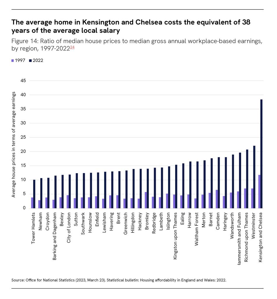 All London boroughs have seen significant rises in the ratio of median house prices to median gross annual earnings, when measured by where people work, since 1997. The highest house prices relative to local earnings are found in Kensington and Chelsea, where the average house costs the equivalent of 38 years of average earnings in the borough. The lowest is in Tower Hamlets – however, this is likely driven by the high wages on offer in part of the borough, Canary Wharf; it does not mean that living in Tower Hamlets is affordable for most residents.