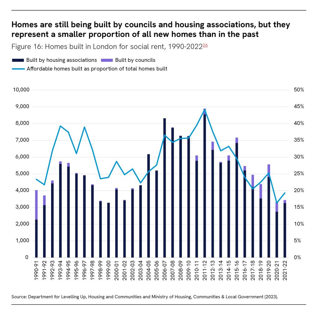 In 1990-91, a total of just over 4,000 homes for social rent were built in London, representing just under a quarter of the total homes built that year. By 2021-22, the number is fairly similar – just under 3,500 social homes built, which now represents just under a fifth of total homes built. However, the composition of those social homes has changed – at the start of the 1990s, councils built 43 per cent of social housing in London. By 2021-22, they built just 5 per cent, with housing associations building the rest.