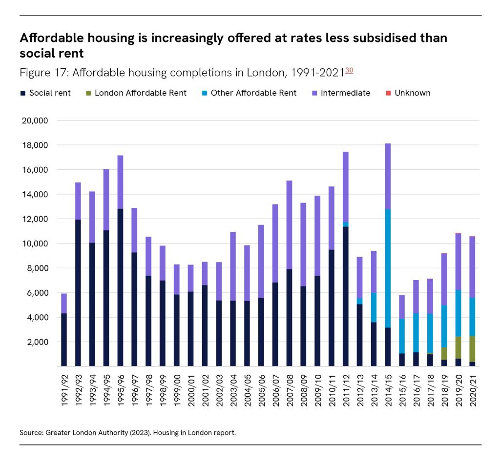 Then, under Mayor Khan, the category of London Affordable Rent came into being – a tenure specific to London that charges close to social rent levels and is generally considered a comparable, if not identical, category. By 2020-21, Social and London Affordable Rent together made up a quarter of new affordable housing completions, with intermediate still comprising the lion’s share.