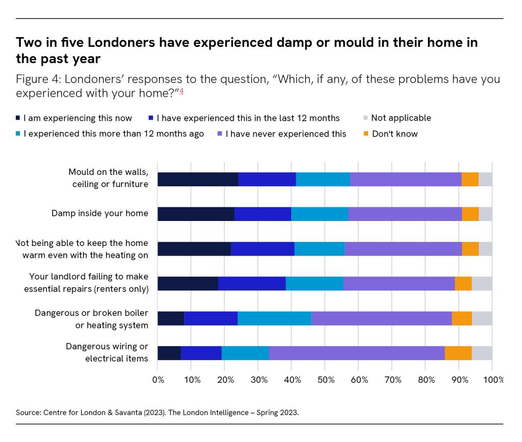 For too long, too many Londoners experience poor housing conditions. A substantial minority of Londoners report experiencing potentially harmful conditions in their home such as damp and mould at present, or having done so in the past year. The most commonly experienced of these were: mould on the walls, ceiling, or furniture of their home (41 per cent); not being able to keep the home warm with the heating on (41 per cent); and damp inside their home (40 per cent).