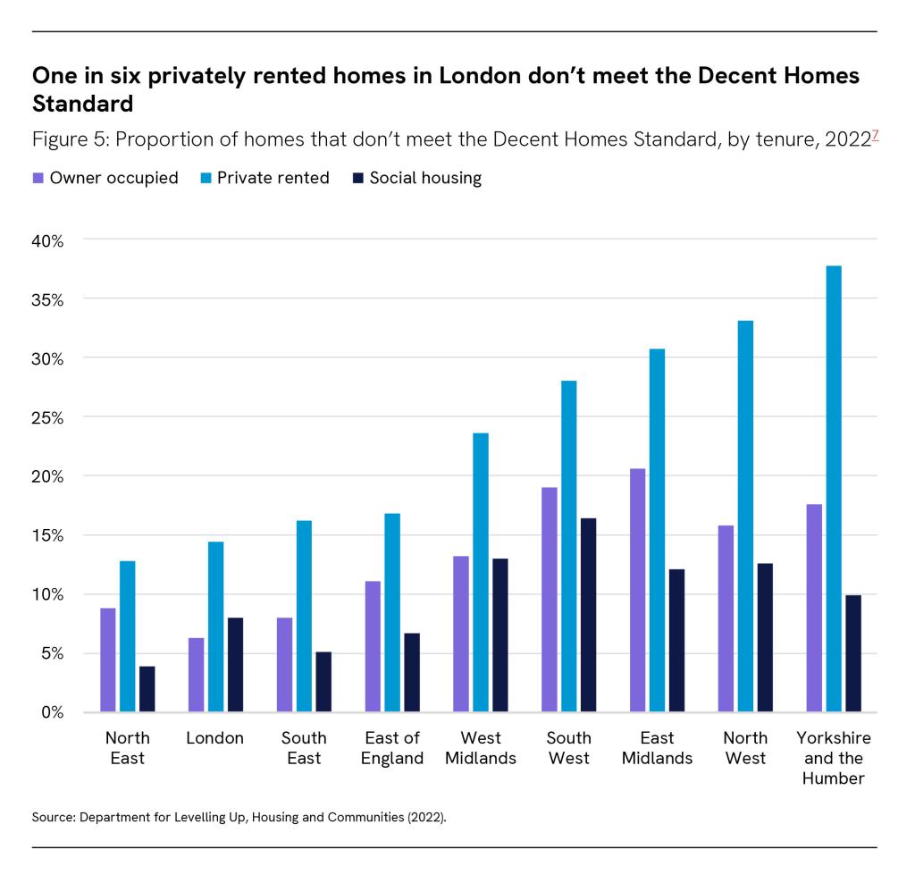 The Decent Homes Standard says a ‘decent’ home should be safe, in good repair, have modern facilities like a properly located kitchen and bathroom, and provide a comfortable level of warmth. In 2021, just under 9 per cent of homes in London did not meet this standard, a reduction from 25 per cent in 2010. 2 This is positive but more needs to be done to ensure that all Londoners can access a decent home. Further, the proportion of homes that meet the standard varies significantly by tenure, with nearly 15 per cent of privately rented homes failing to meet it, compared to 8 per cent of socially rented homes and 6.3 per cent of owner occupied homes.