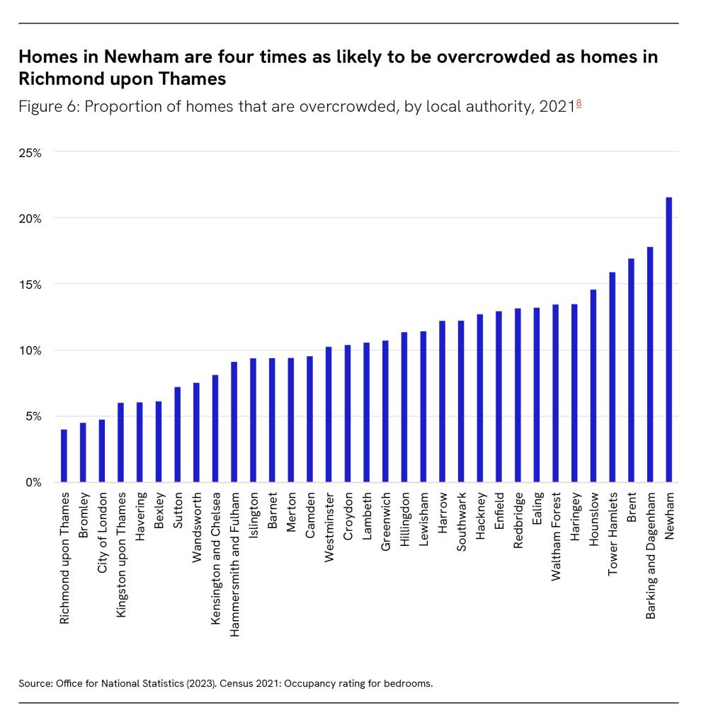 11 per cent of homes in London are overcrowded, compared to 4 per cent of homes across England. In some parts of London, the proportion of homes that are overcrowded is even higher: it is over 20 per cent in Newham, for instance.